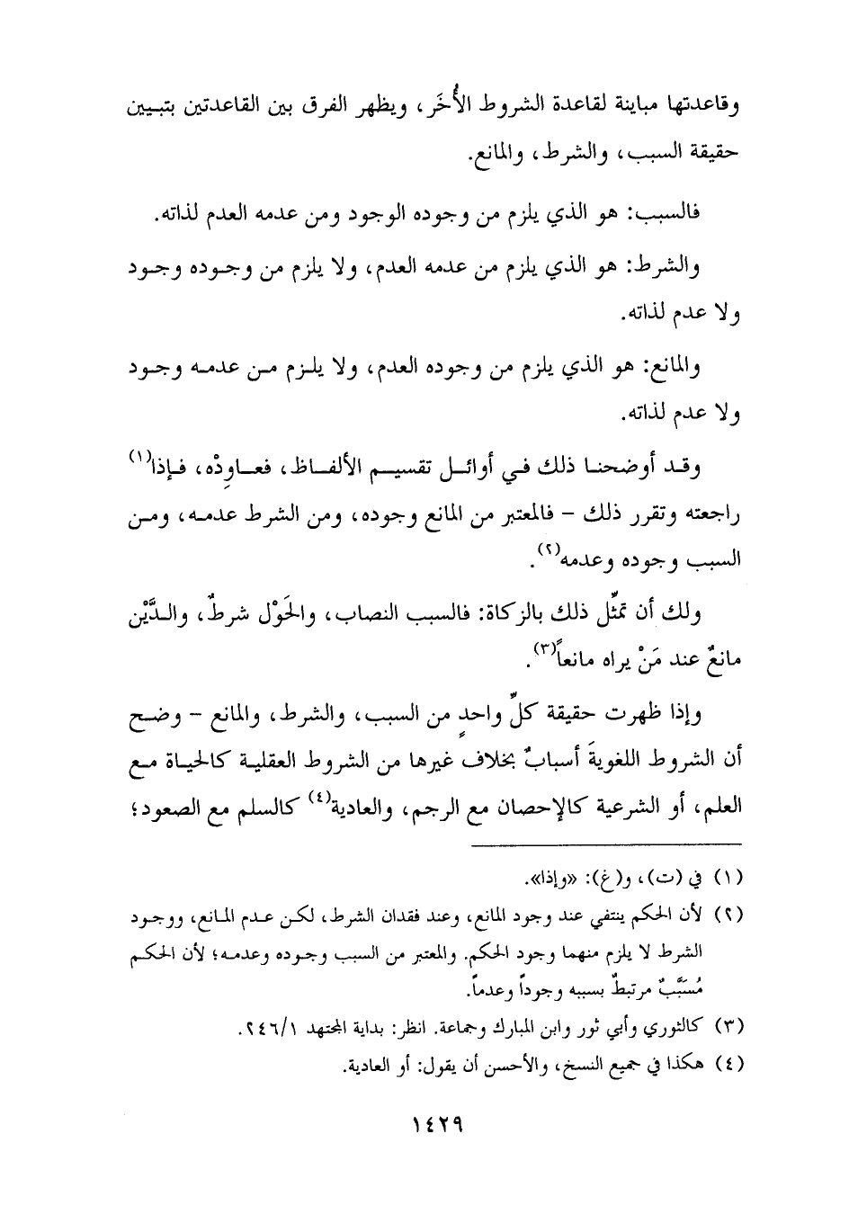 (¬٢) لأن الحكم ينتفي عند وجود المانع، وعند فقدان الشرط، لكن عدم المانع، ووجود الشرط لا يلزم منهما وجود الحكم. والمعتبر من السبب وجوده وعدمه؛ لأن الحكم مُسَبِّبٌ مرتبطٌ بسببه وجودًا وعدمًا.