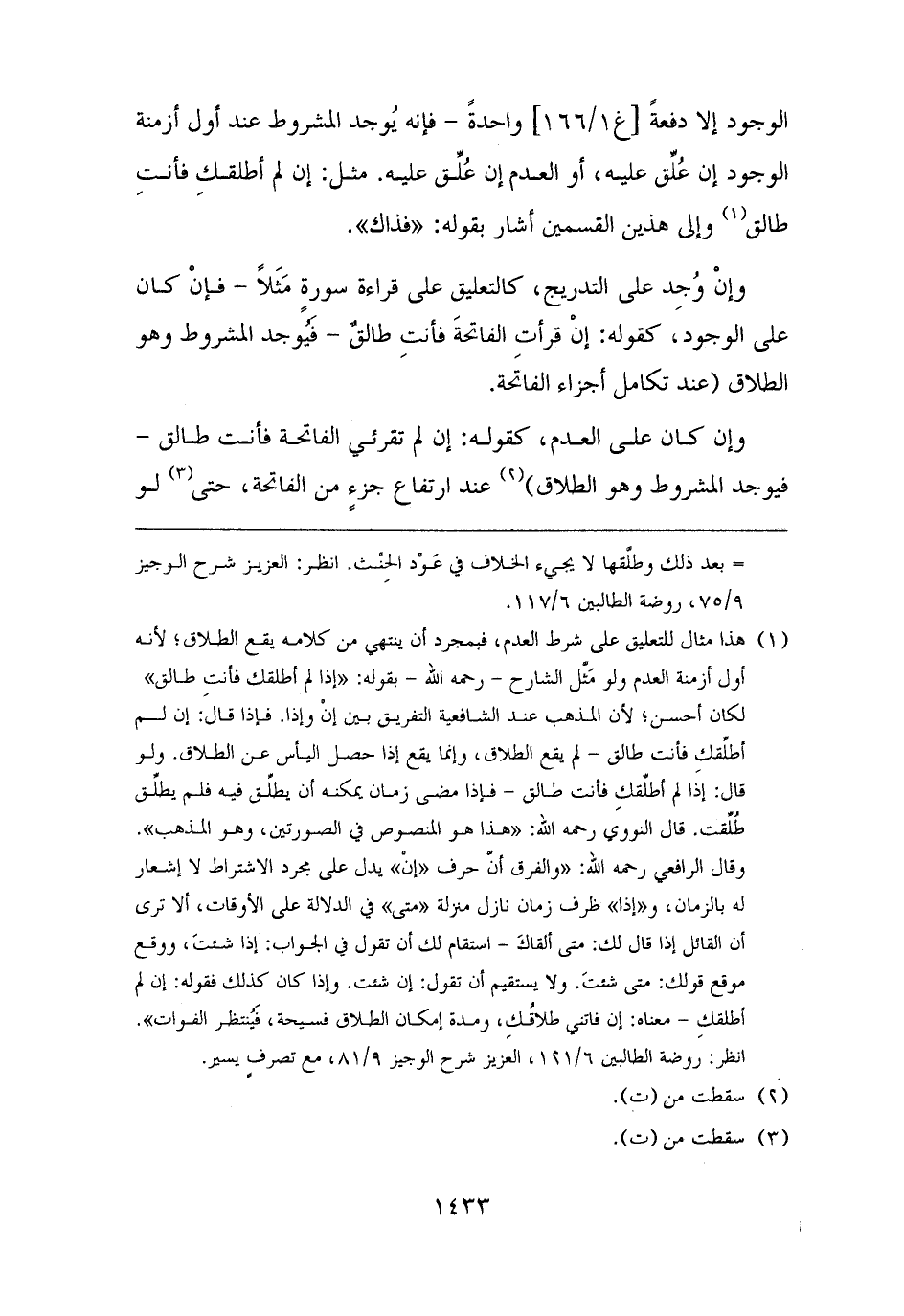 الوجود إلا دفعةً واحدةً - فإنه يُوجد المشروط عند أول أزمنة الوجود إن عُلِّق عليه، أو العدم إن عُلِّق عليه. مثل: إن لم أطلقكِ فأنتِ طالق (¬١) وإلى هذين القسمين أشار بقوله: "فذاك".