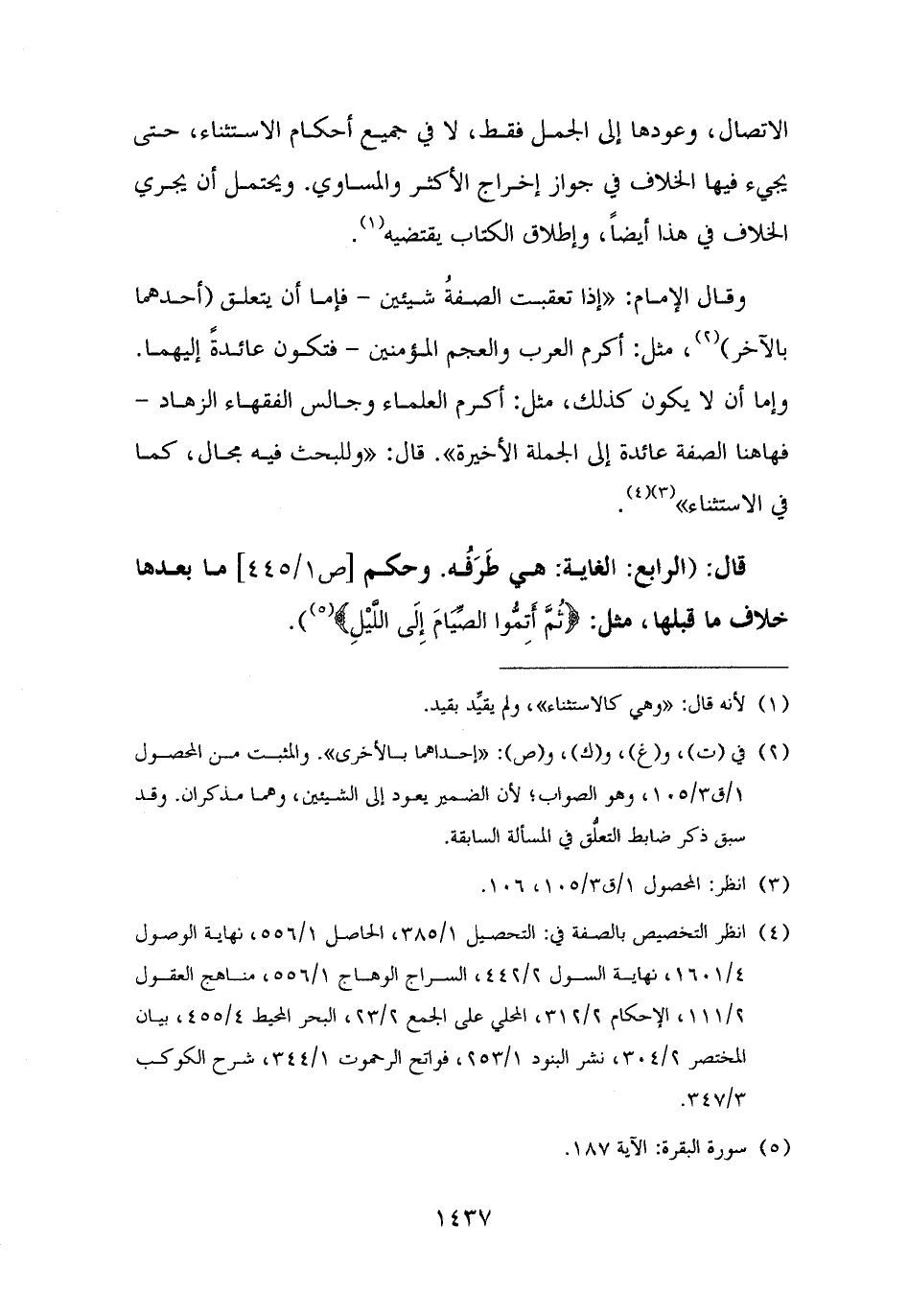 (¬٤) انظر التخصيص بالصفة في: التحصيل ١/ ٣٨٥، الحاصل ١/ ٥٥٦، نهاية الوصول ٤/ ١٦٠١، نهاية السول ٢/ ٤٤٢، السراج الوهاج ١/ ٥٥٦، مناهج العقول ٢/ ١١١، الإحكام ٢/ ٣١٢، المحلي على الجمع ٢/ ٢٣، البحر المحيط ٤/ ٤٥٥، بيان المختصر ٢/ ٣٠٤، نشر البنود ١/ ٢٥٣، فواتح الرحموت ١/ ٣٤٤، شرح الكوكب ٣/ ٣٤٧.
