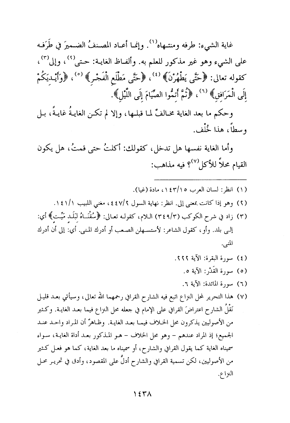 (¬٧) هذا التحرير لمحل النزاع اتبع فيه الشارح القرافي رحمهما الله تعالى، وسيأتي بعد قليل نَقْلُ الشارح اعتراضَ القرافي على الإمام في جعله محل النزاع فيما بعد الغاية. وكثير من الأصوليين يذكرون محل الخلاف فيما بعد الغاية. وظاهرٌ أن المراد واحد عند الجميع، إذ المراد عندهم - وهو محل الخلاف - هو المذكور بعد أداة الغاية، سواء سميناه الغاية كما يقول القرافي والشارح، أو سميناه ما بعد الغاية، كما هو فعل كثير من الأصوليين، لكن تسمية القرافي والشارح أدلُّ على المقصود، وأدق في تحرير محل النزاع.