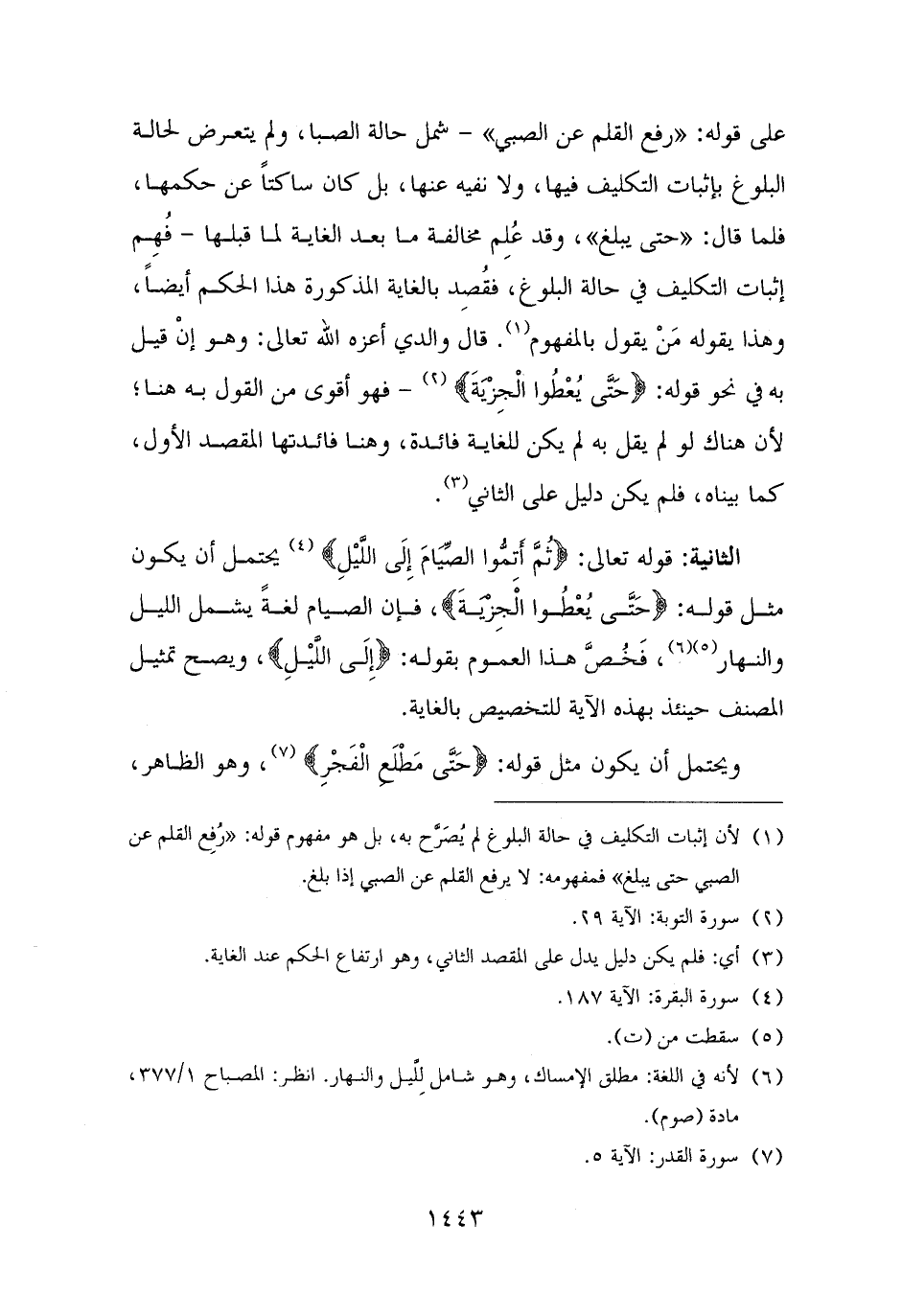 (¬١) لأن إثبات التكليف في حالة البلوغ لم يُصَرَّح به، بل هو مفهوم قوله: "رُفِع القلم عن الصبي حتى يبلغ" فمفهومه: لا يرفع القلم عن الصبي إذا بلغ.