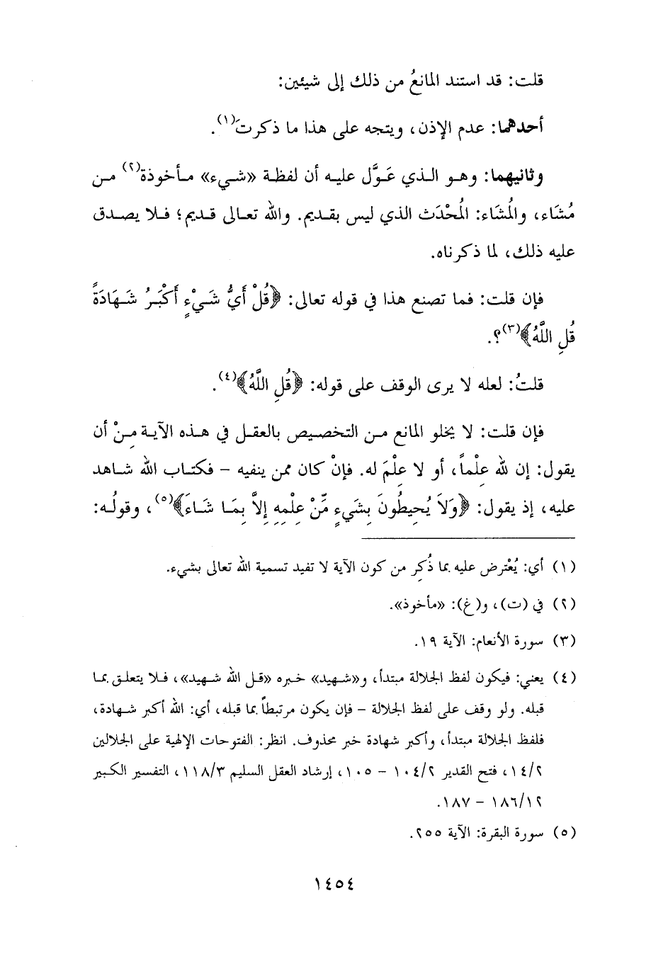 قلتُ: لعله لا يرى الوقف على قوله: {قُلِ اللَّهُ} (¬٤).