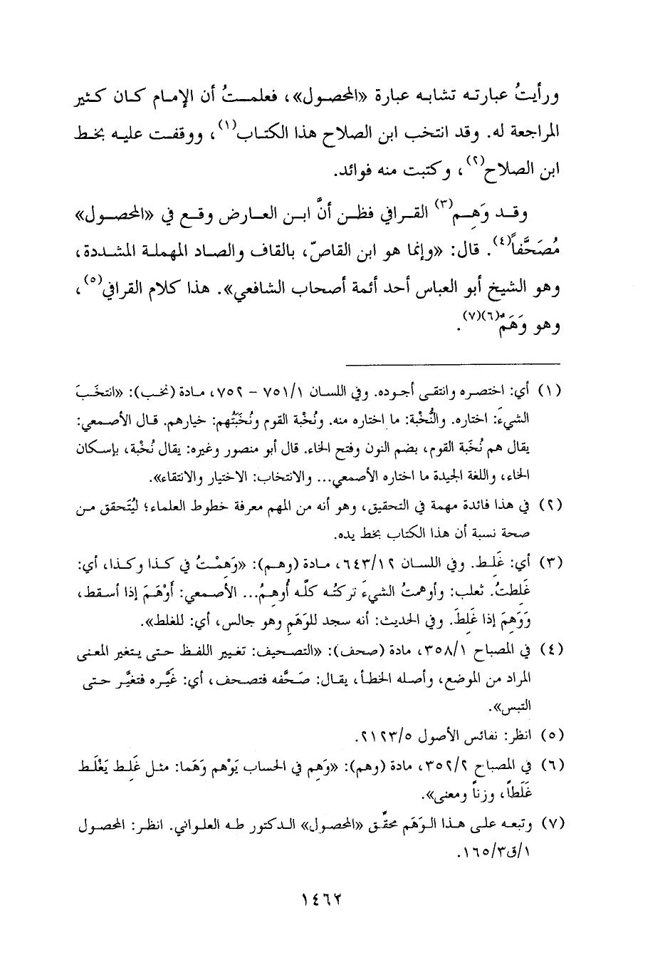 (¬٧) وتبعه على هذا الوَهَم محقِّق "المحصول" الدكتور طه العلواني. انظر: المحصول ١/ ق ٣/ ١٦٥.