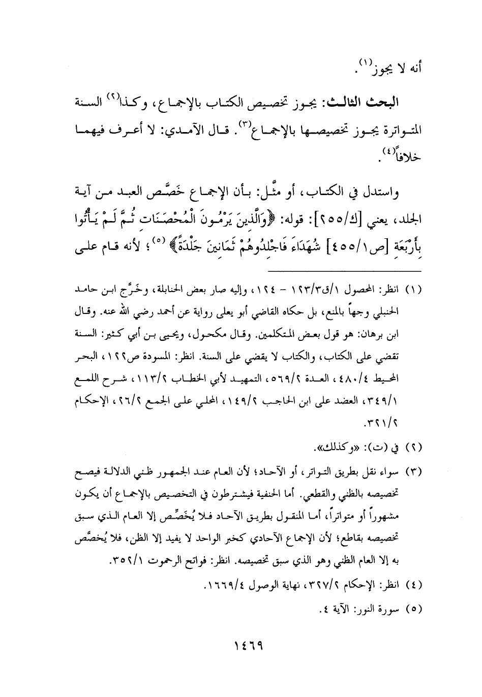 البحث الثالث: يجوز تخصيص الكتاب بالإجماع، وكذا (¬٢) السنة المتواترة يجوز تخصيصها بالإجماع (¬٣). قال الآمدي: لا أعرف فيهما خلافًا (¬٤).