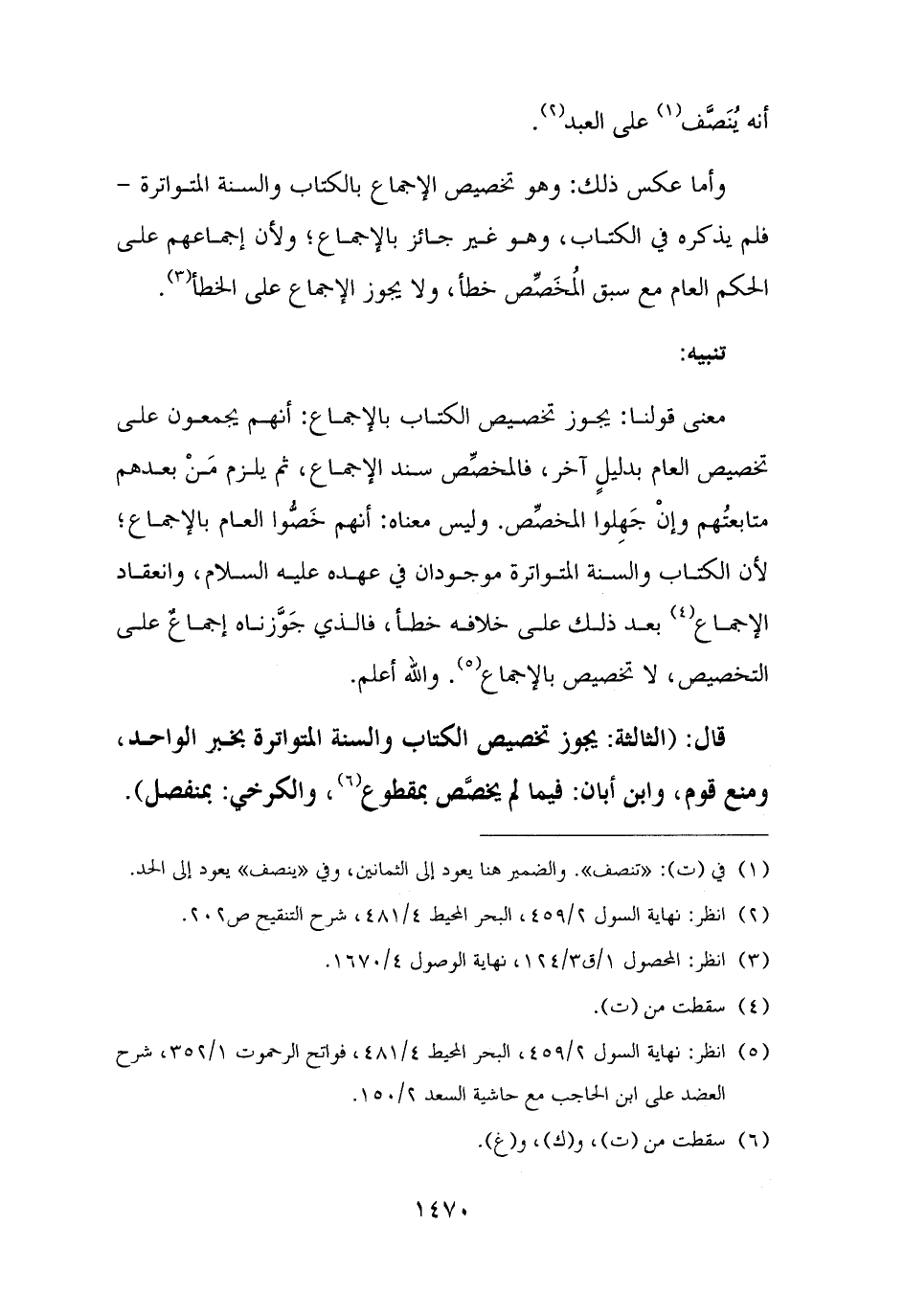 معنى قولنا: يجوز تخصيص الكتاب بالإجماع: أنهم يجمعون على تخصيص العام بدليلٍ آخر، فالمخصِّص سند الإجماع، ثم يلزم مَنْ بعدهم متابعتُهم وإنْ جَهِلوا المخصِّص. وليس معناه: أنهم خَصُّوا العام بالإجماع؛ لأن الكتاب والسنة المتواترة موجودان في عهده عليه السلام، وانعقاد الإجماع (¬٤) بعد ذلك على خلافه خطأ، فالذي جَوَّزناه إجماعٌ على التخصيص، لا تخصيص بالإجماع (¬٥). والله أعلم.