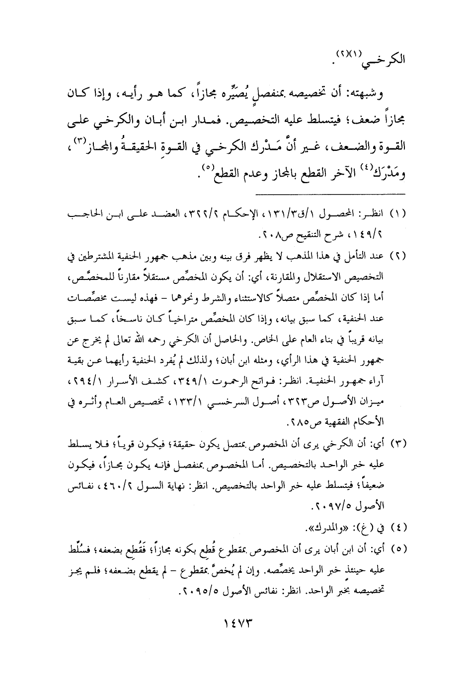 (¬٣) أي: أن الكرخي يرى أن المخصوص بمتصل يكون حقيقة؛ فيكون قويًا؛ فلا يسلط عليه خبر الواحد بالتخصيص. أما المخصوص بمنفصل فإنه يكون مجازًا، فيكون ضعيفًا؛ فيتسلط عليه خبر الواحد بالتخصيص. انظر: نهاية السول ٢/ ٤٦٠، نفائس الأصول ٥/ ٢٠٩٧.