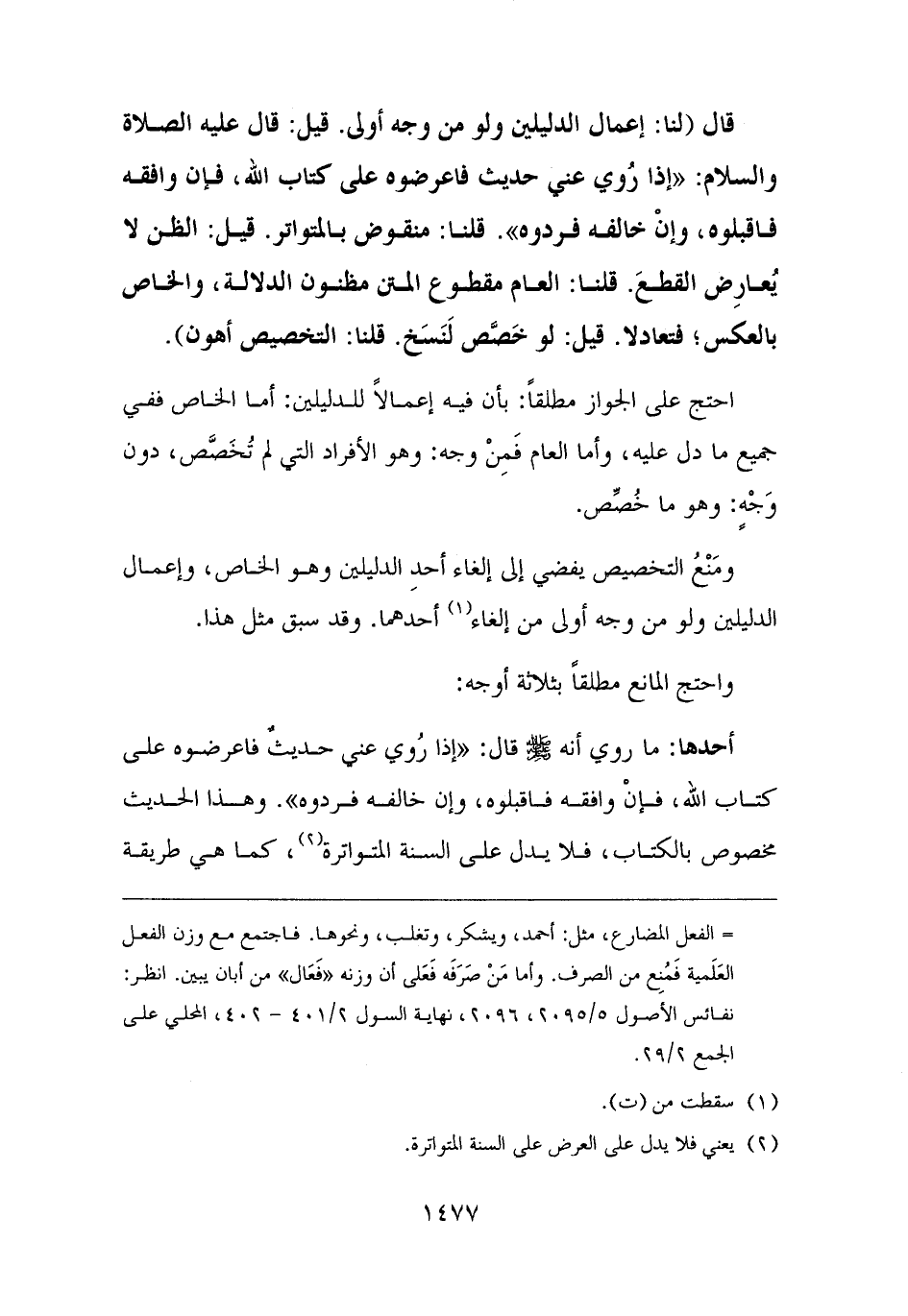 قال (لنا: إعمال الدليلين ولو من وجه أولى. قيل: قال عليه الصلاة والسلام: "إذا رُوي عني حديث فاعرضوه على كتاب الله، فإن وافقه فاقبلوه، وإنْ خالفه فردوه". قلنا: منقوض بالمتواتر. قيل: الظن لا يُعارِض القطعَ. قلنا: العام مقطوع المتن مظنون الدلالة، والخاص بالعكس؛ فتعادلا. قيل: لو خَصَّص لَنَسَخ. قلنا: التخصيص أهون).