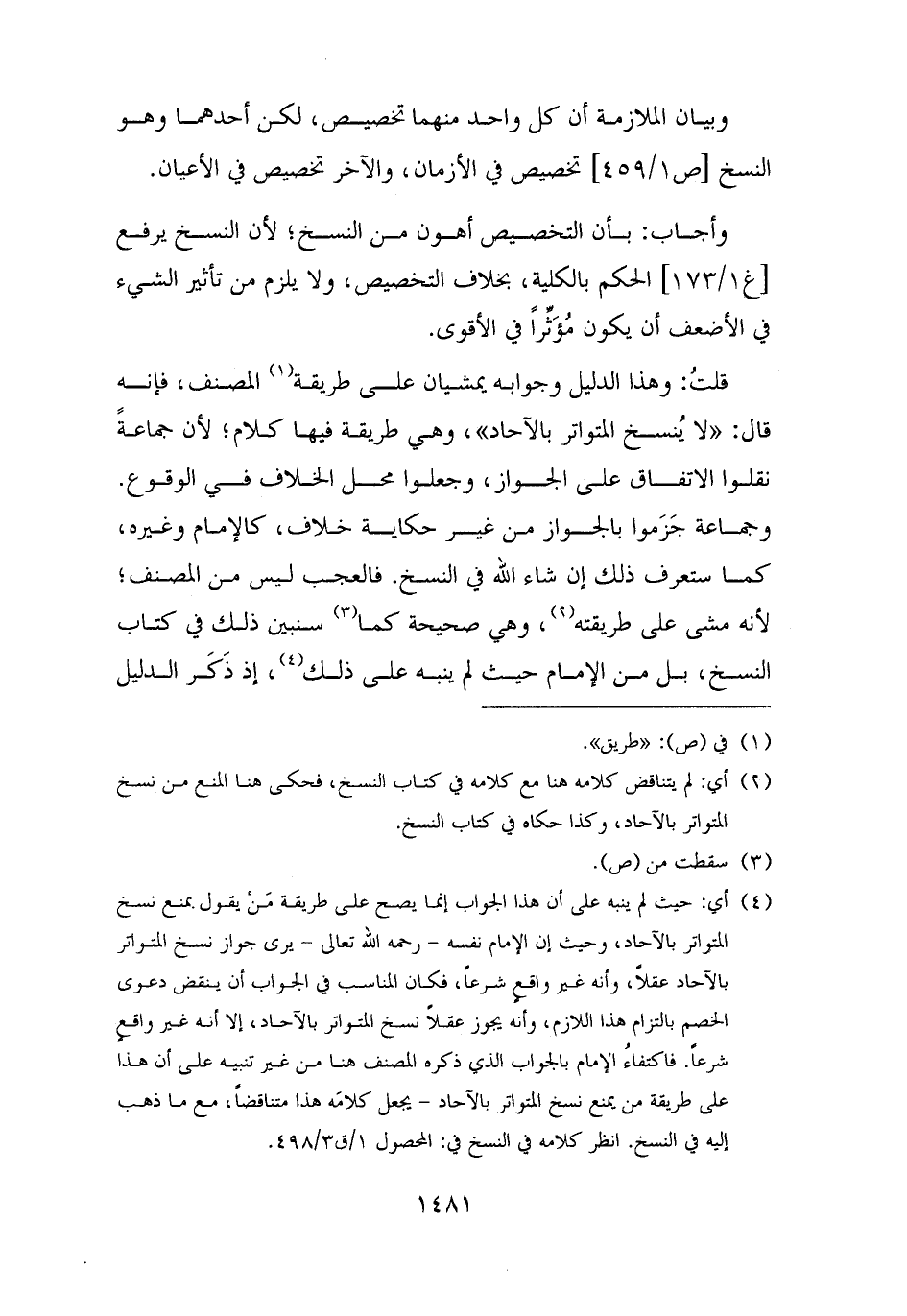 (¬٤) أي: حيث لم ينبه على أن هذا الجواب إنما يصح على طريقة مَنْ يقول بمنع نسخ المتواتر بالآحاد، وحيث إن الإمام نفسه - رحمه الله تعالى - يرى جواز نسخ المتواتر بالآحاد عقلًا، وأنه غير واقعٍ شرعًا، فكان المناسب في الجواب أن ينقض دعوى الخصم بالتزام هذا اللازم، وأنه يجوز عقلًا نسخ المتواتر بالآحاد، إلا أنه غير واقعٍ شرعًا. فاكتفاءُ الإمام بالجواب الذي ذكره المصنف هنا من غير تنبيه على أن هذا على طريقة من يمنع نسخ المتواتر بالآحاد - يجعل كلامَه هذا متناقضًا، مع ما ذهب إليه في النسخ. انظر كلامه في النسخ في: المحصول ١/ ق ٣/ ٤٩٨.