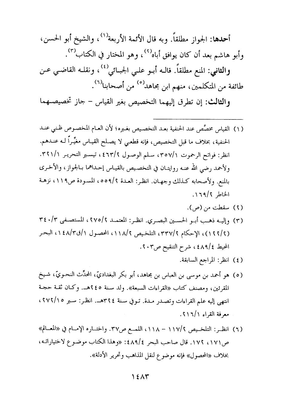 (¬٦) انظر: التلخيص ٢/ ١١٧ - ١١٨، اللمع ص ٣٧. واختاره الإمام في "المعالم" ص ١٧١، ١٧٢. قال صاحب البحر ٤/ ٤٨٩: "وهذا الكتاب موضوع لاختياراته، بخلاف "المحصول" فإنه موضوع لنقل الذاهب وتحرير الأدلة".