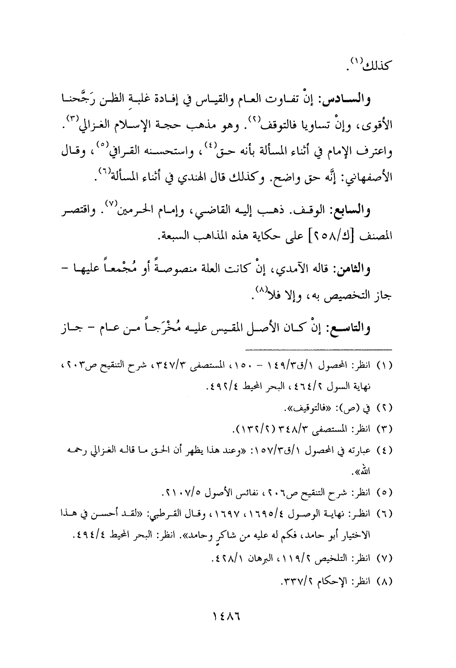 (¬٦) انظر: نهاية الوصول ٤/ ١٦٩٥، ١٦٩٧، وقال القرطبي: "لقد أحسن في هذا الاختيار أبو حامد، فكم له عليه من شاكرٍ وحامد". انظر: البحر المحيط ٤/ ٤٩٤.