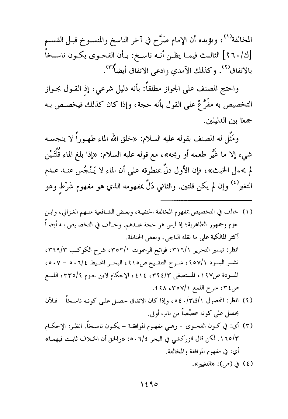 (¬٣) أي: في كون الفحوى - وهي مفهوم الموافقة - يكون ناسخًا. انظر: الإحكام ٣/ ١٦٥. لكن قال الزركشي في البحر ٤/ ٥٠٦: "والحق أن الخلاف ثابت فيهما" أي: في مفهوم الموافقة والمخالفة.