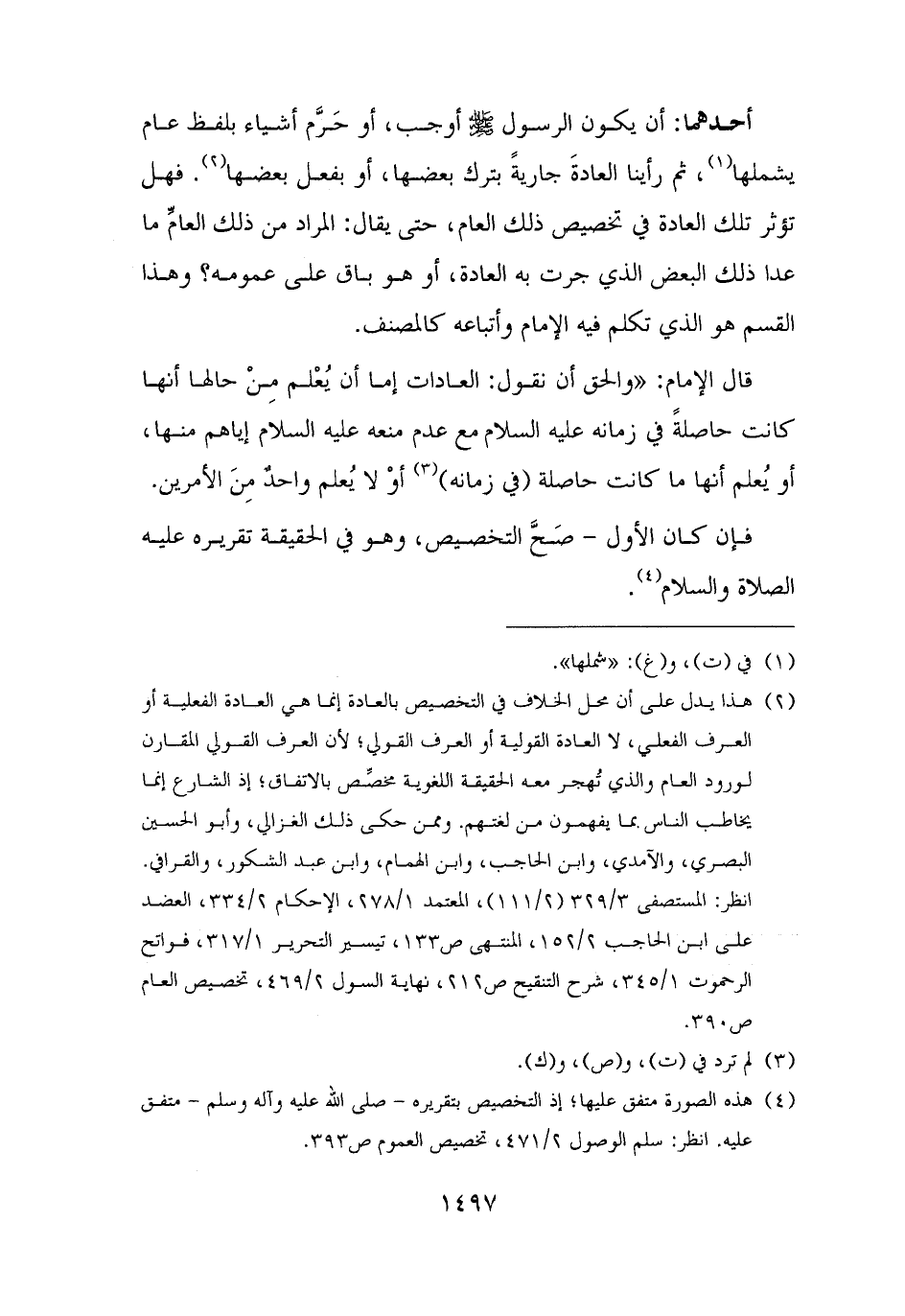 (¬٢) هذا يدل على أن محل الخلاف في التخصيص بالعادة إنما هي العادة الفعلية أو العرف الفعلي، لا العادة القولية أو العرف القولي؛ لأن العرف القولي المقارن لورود العام والذي تُهجر معه الحقيقة اللغوية مخصِّص بالاتفاق؛ إذ الشارع إنما يخاطب الناس بما يفهمون من لغتهم. وممن حكى ذلك الغزالي، وأبو الحسين البصري، والآمدي، وابن الحاجب، وابن الهمام، وابن عبد الشكور، والقرافي. انظر: المستصفى ٣/ ٣٢٩ (٢/ ١١١)، المعتمد ١/ ٢٧٨، الإحكام ٢/ ٣٣٤، العضد على ابن الحاجب ٢/ ١٥٢، المنتهى ص ١٣٣، تيسير التحرير ١/ ٣١٧، فواتح الرحموت ١/ ٣٤٥، شرح التنقيح ص ٢١٢، نهاية السول ٢/ ٤٦٩، تخصيص العام ص ٣٩٠.