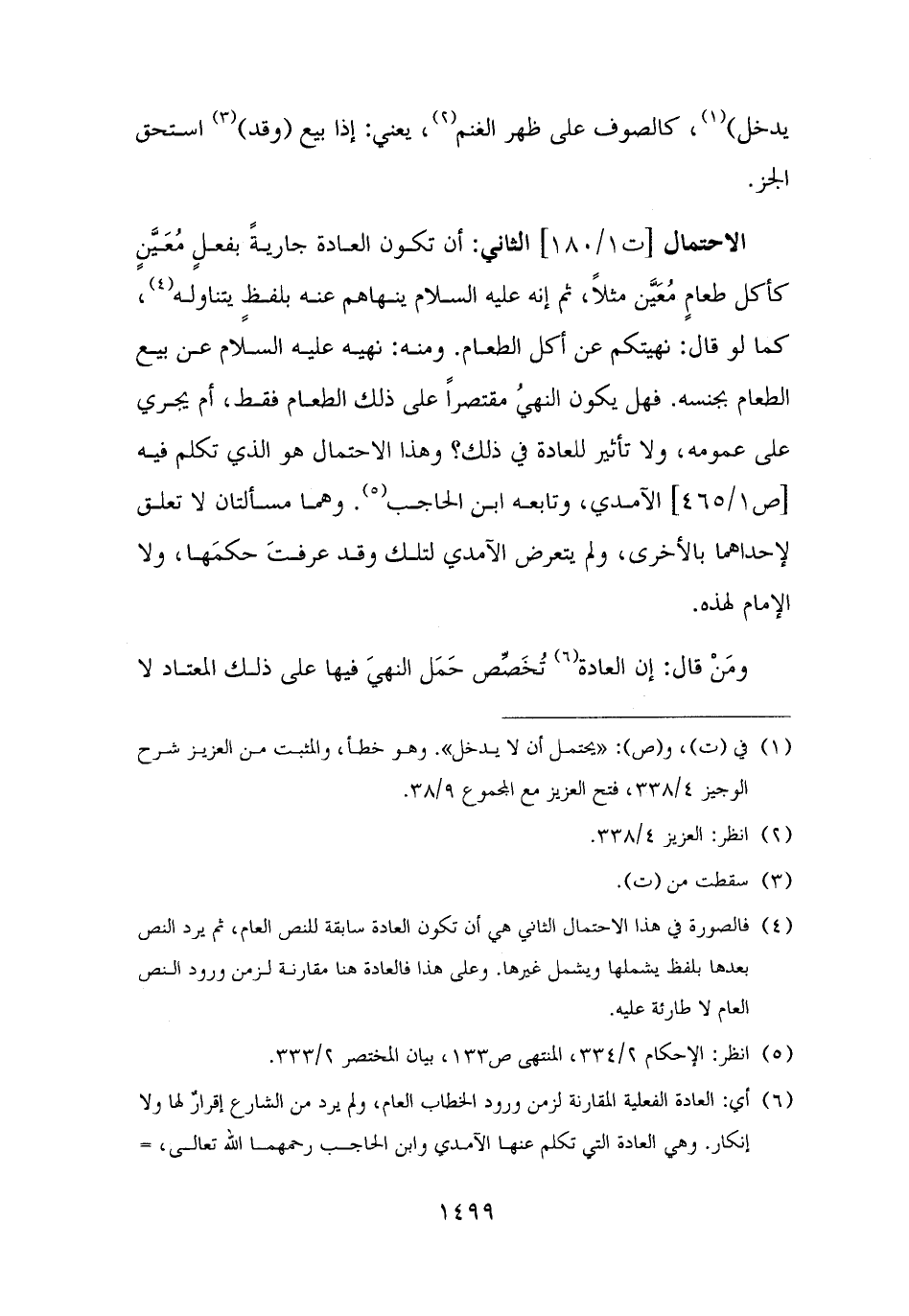 الاحتمال الثاني: أن تكون العادة جاريةً بفعلٍ مُعَيَّنٍ كأكل طعامٍ مُعَيَّن مثلًا، ثم إنه عليه السلام ينهاهم عنه بلفظٍ يتناوله (¬٤)، كما لو قال: نهيتكم عن أكل الطعام. ومنه: نهيه عليه السلام عن بيع الطعام بجنسه. فهل يكون النهيُ مقتصرًا على ذلك الطعام فقط، أم يجري على عمومه، ولا تأثير للعادة في ذلك؟ وهذا الاحتمال هو الذي تكلم فيه الآمدي، وتابعه ابن الحاجب (¬٥). وهما مسألتان لا تعلق لإحداهما بالأخرى، ولم يتعرض الآمدي لتلك وقد عرفتَ حكمَها، ولا الإمام لهذه.