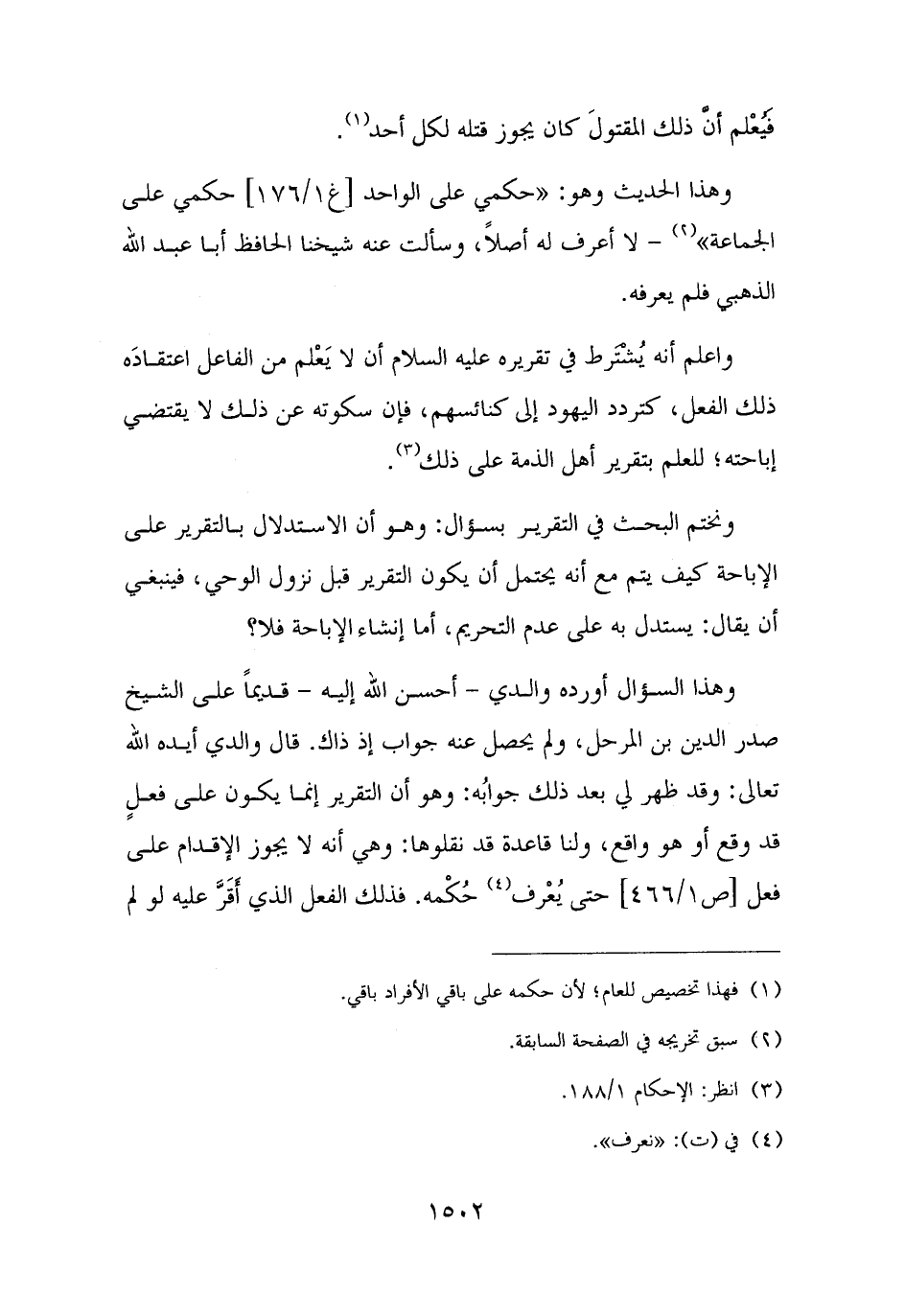 وهذا السؤال أورده والدي - أحسن الله إليه - قديمًا على الشيخ صدر الدين بن المرحل، ولم يحصل عنه جواب إذ ذاك. قال والدي أيده الله تعالى: وقد ظهر لي بعد ذلك جوابُه: وهو أن التقرير إنما يكون على فعلٍ قد وقع أو هو واقع، ولنا قاعدة قد نقلوها: وهي أنه لا يجوز الإقدام على فعل حتى يُعْرف (¬٤) حُكْمه. فذلك الفعل الذي أَقَرَّ عليه لو لم