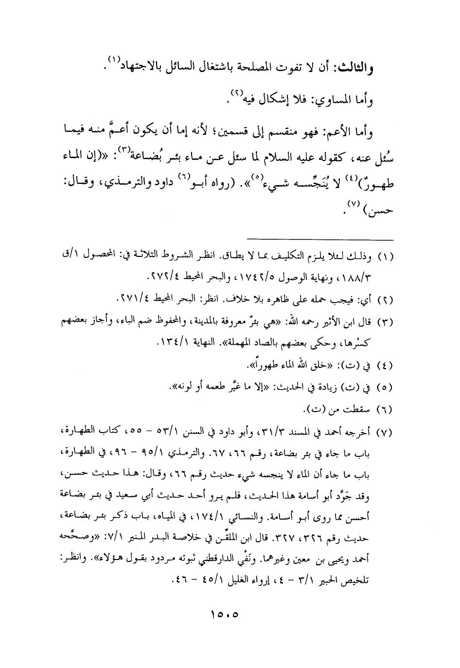 (¬٧) أخرجه أحمد في المسند ٣/ ٣١، وأبو داود في السنن ١/ ٥٣ - ٥٥، كتاب الطهارة، باب ما جاء في بئر بضاعة، رقم ٦٦، ٦٧. والترمذي ١/ ٩٥ - ٩٦، في الطهارة، باب ما جاء أن الماء لا ينجسه شيء حديث رقم ٦٦، وقال: هذا حديث حسن، وقد جَوَّد أبو أسامة هذا الحديث، فلم يرو أحد حديث أبي سعيد في بئر بضاعة أحسن مما روى أبو أسامة. والنسائي ١/ ١٧٤، في المياه، باب ذكر بئر بضاعة، حديث رقم ٣٢٦، ٣٢٧. قال ابن الملقِّن في خلاصة البدر المنير ١/ ٧: "وصحَّحه أحمد ويحيى بن معين وغيرهما. ونَفْي الدارقطني ثبوته مردود بقول هؤلاء". وانظر: تلخيص الحبير ١/ ٣ - ٤، إرواء الغليل ١/ ٤٥ - ٤٦.