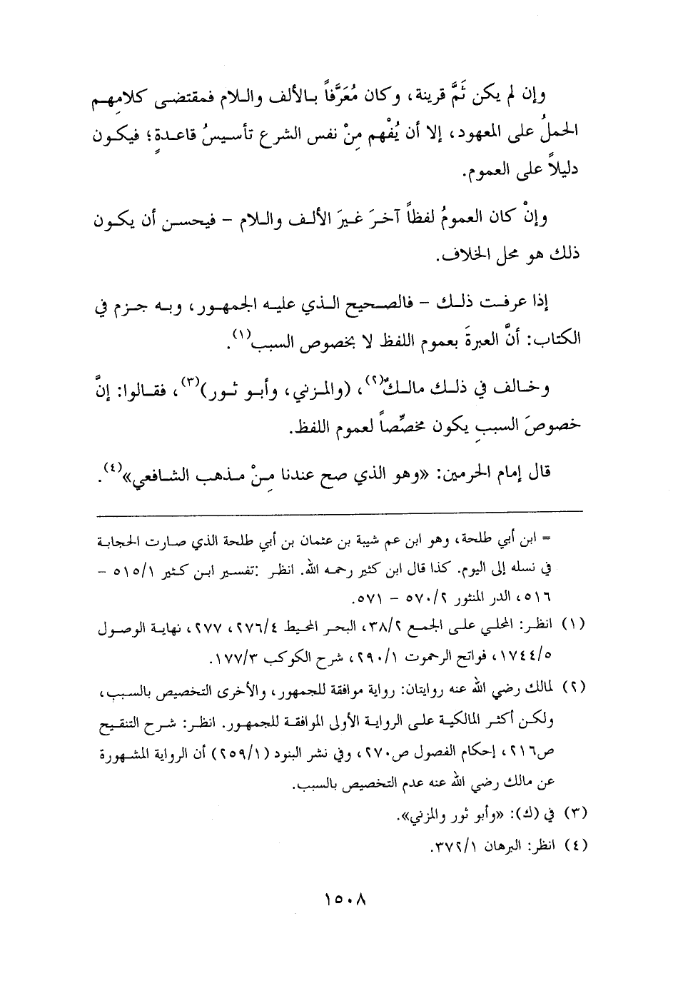 (¬٢) لمالك رضي الله عنه روايتان: رواية موافقة للجمهور، والأخرى التخصيص بالسبب، ولكن أكثر المالكية على الرواية الأولى الموافقة للجمهور. انظر: شرح التنقيح ص ٢١٦، إحكام الفصول ص ٢٧٠، وفي نشر البنود (١/ ٢٥٩) أن الرواية المشهورة عن مالك رضي الله عنه عدم التخصيص بالسبب.