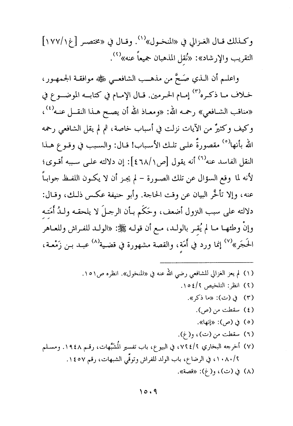 واعلم أن الذي صَحَّ من مذهب الشافعي - رضي الله عنه - موافقة الجمهور، خلاف ما ذكره (¬٣) إمام الحرمين. قال الإمام في كتابه الموضوع في "مناقب الشافعي" رحمه الله: "ومعاذ الله أن يصح هذا النقل عنه (¬٤)، وكيف وكثيرٌ من الآيات نزلت في أسباب خاصة، ثم لم يقل الشافعي رحمه الله بأنها (¬٥) مقصورةٌ على تلك الأسباب! قال: والسبب في وقوع هذا النقل الفاسد عنه (¬٦) أنه يقول: إن دلالته على سببه أقوى؛ لأنه لما وقع السؤال عن تلك الصورة - لم يجز أن لا يكون اللفظ جوابًا عنه، وإلا تأخَّر البيان عن وقت الحاجة. وأبو حنيفة عكس ذلك، وقال: دلالته على سبب النزول أضعف، وحَكَم بأن الرجلَ لا يلحقه ولدُ أَمَتِهِ وإنْ وطئها ما لم يُقِر بالولد، مع أن قوله - صلى الله عليه وسلم -: "الولد للفراش وللعاهر الحَجَر" (¬٧) إنما ورد في أَمَةٍ، والقصة مشهورة في قضية (¬٨) عبد بن زَمْعة،