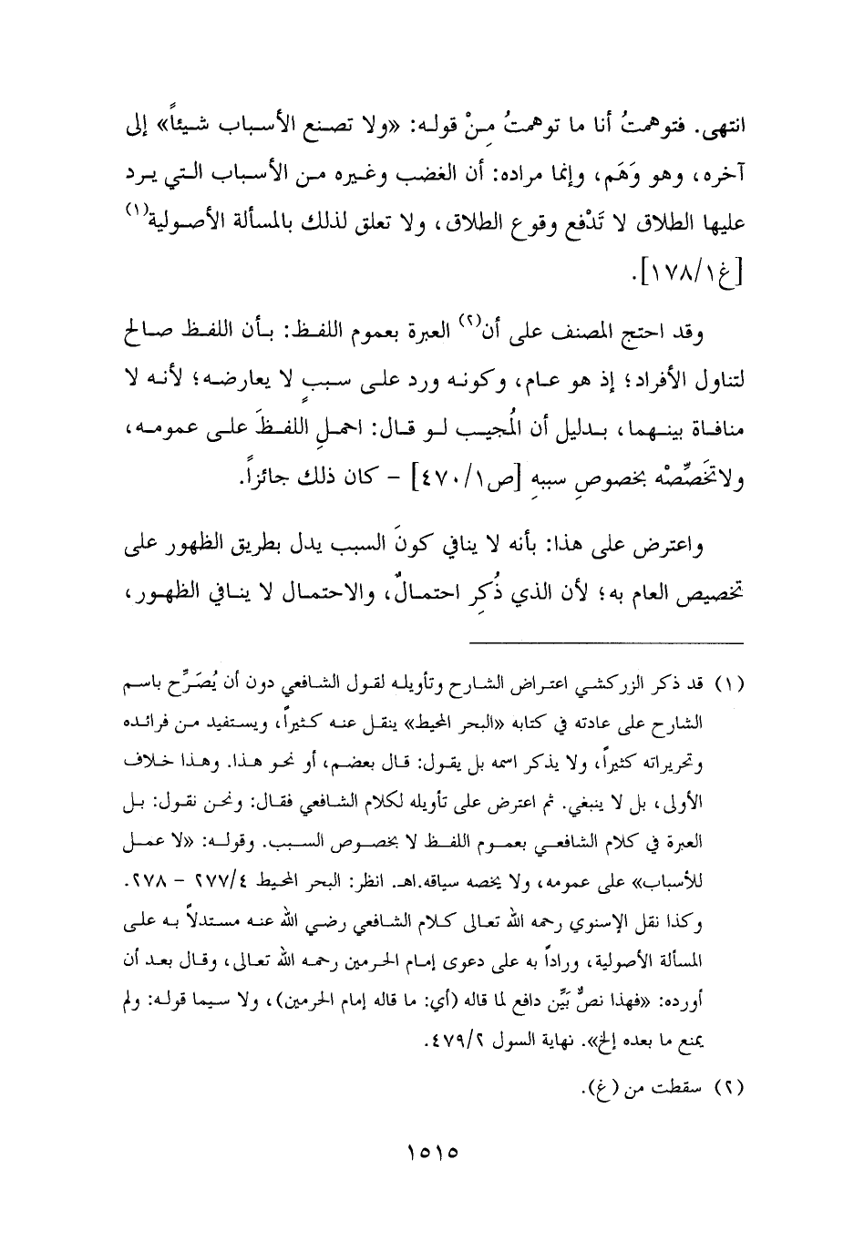(¬١) قد ذكر الزركشي اعتراض الشارح وتأويله لقول الشافعي دون أن يُصَرِّح باسم الشارح على عادته في كتابه "البحر المحيط" ينقل عنه كثيرًا، ويستفيد من فرائده وتحريراته كثيرًا، ولا يذكر اسمه بل يقول: قال بعضم، أو نحو هذا. وهذا خلاف الأولى، بل لا ينبغي. ثم اعترض على تأويله لكلام الشافعي فقال: ونحن نقول: بل العبرة في كلام الشافعي بعموم اللفظ لا بخصوص السبب. وقوله: "لا عمل للأسباب" على عمومه، ولا يخصه سياقه. اهـ. انظر: البحر المحيط ٤/ ٢٧٧ - ٢٧٨. وكذا نقل الإسنوي رحمه الله تعالى كلام الشافعي رضى الله عنه مستدلًا به على المسألة الأصولية، ورادًا به على دعوى إمام الحرمين رحمه الله تعالى، وقال بعد أن أورده: "فهذا نصٌّ بَيِّن دافع لما قاله (أي: ما قاله إمام الحرمين)، ولا سيما قوله: ولم يمنع ما بعده إلخ". نهاية السول ٢/ ٤٧٩.