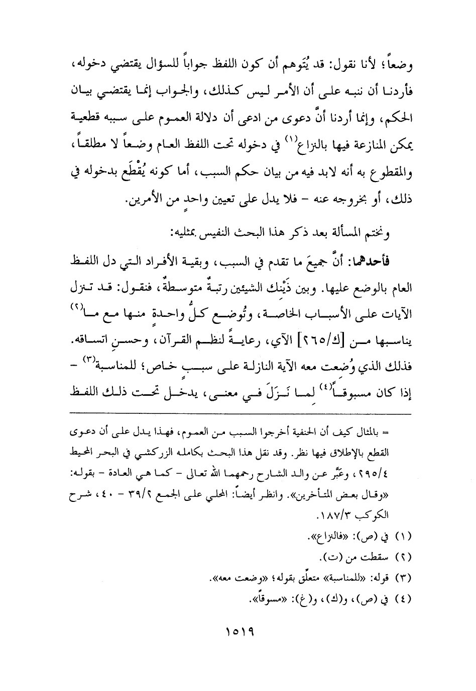 وضعًا؛ لأنا نقول: قد يُتَوهم أن كون اللفظ جوابًا للسؤال يقتضي دخوله، فأردنا أن ننبه على أن الأمر ليس كذلك، والجواب إنما يقتضي بيان الحكم، وإنما أردنا أن دعوى من ادعى أن دلالة العموم على سببه قطعية يمكن المنازعة فيها بالنزاع (¬١) في دخوله تحت اللفظ العام وضعًا لا مطلقًا، والمقطوع به أنه لا بد فيه من بيان حكم السبب، أما كونه يُقْطَع بدخوله في ذلك، أو بخروجه عنه - فلا يدل على تعيين واحدٍ من الأمرين.