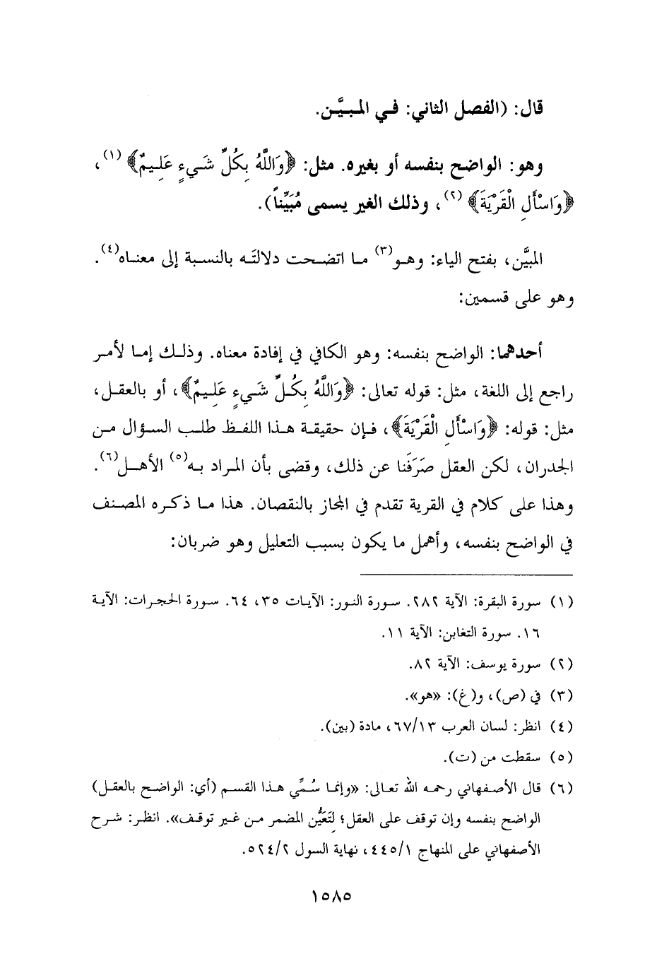 وهو: الواضح بنفسه أو بغيره. مثل: {وَاللَّهُ بِكُلِّ شَيْءٍ عَلِيمٌ} (¬١) , {وَاسْأَلِ الْقَريةَ} (¬٢)، وذلك الغير يسمى مُبَيِّنًا).