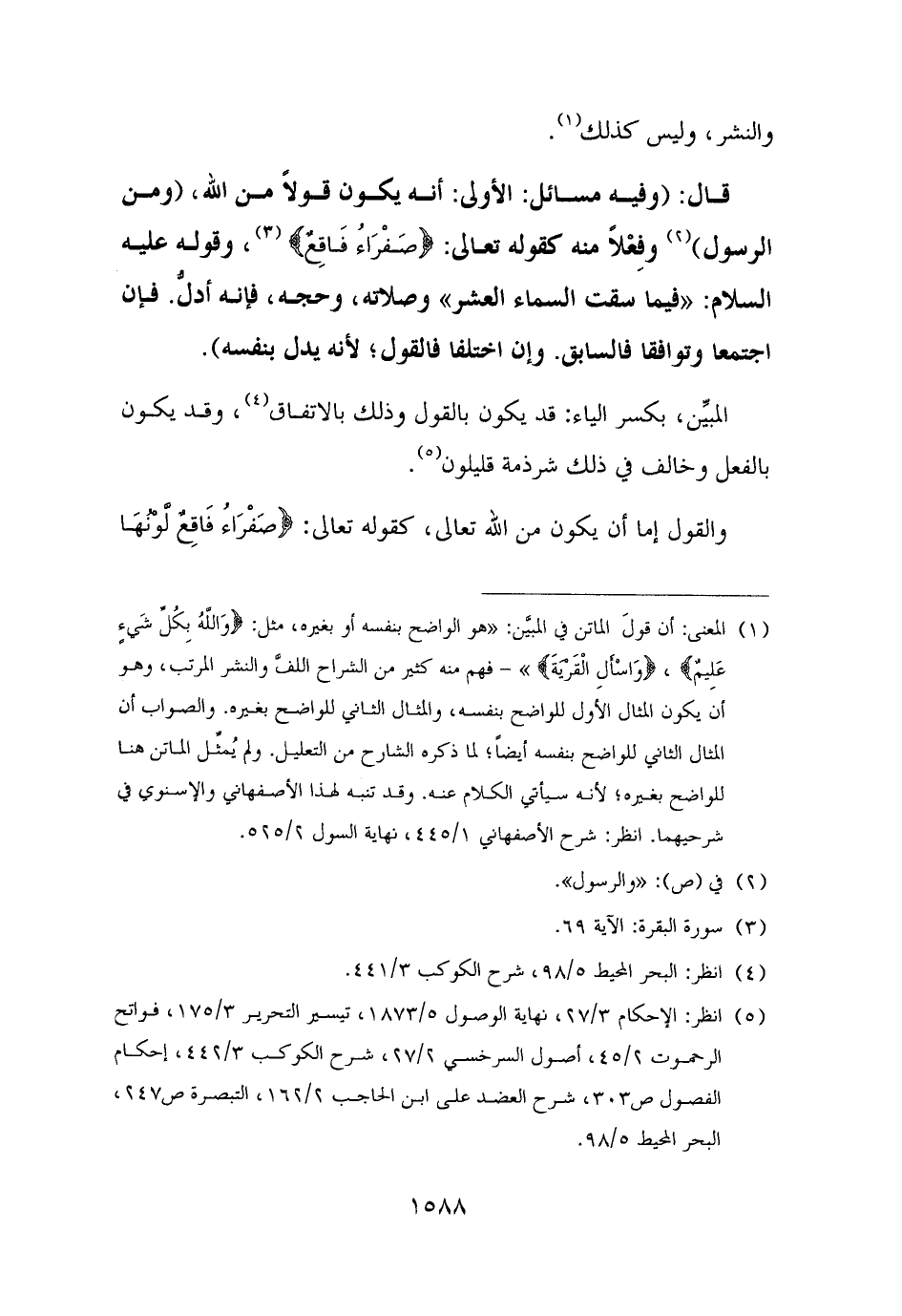 المبيِّن، بكسر الياء: قد يكون بالقول وذلك بالاتفاق (¬٤)، وقد يكون بالفعل وخالف في ذلك شرذمة قليلون (¬٥).