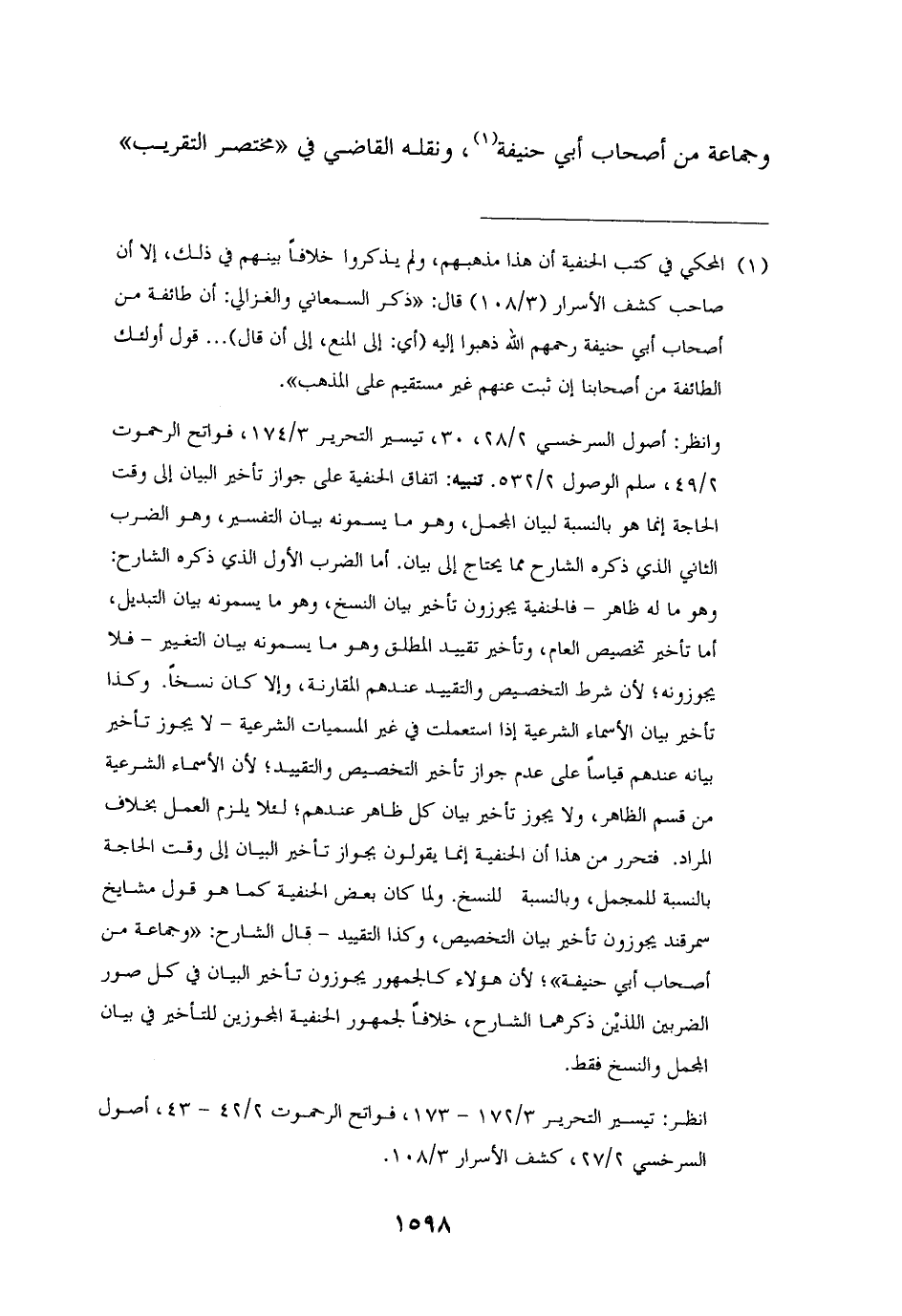وانظر: أصول السرخسي ٢/ ٢٨، ٣٠، تيسير التحرير ٣/ ١٧٤، فواتح الرحموت ٢/ ٤٩، سلم الوصول ٢/ ٥٣٢. تنبيه: اتفاق الحنفية على جواز تأخير البيان إلى وقت الحاجة إنما هو بالنسبة لبيان المجمل، وهو ما يسمونه بيان التفسير، وهو الضرب الثاني الذي ذكره الشارح مما يحتاج إلى بيان. أما الضرب الأول الذي ذكره الشارح: وهو ما له ظاهر - فالحنفية يجوزون تأخير بيان النسخ، وهو ما يسمونه بيان التبديل، أما تأخير تخصيص العام، وتأخير تقييد الطلق وهو ما يسمونه بيان التغيير - فلا يجوزونه؛ لأن شرط التخصيص والتقييد عندهم المقارنة، وإلا كان نسخًا. وكذا تأخير بيان الأسماء الشرعية إذا استعملت في غير المسميات الشرعية - لا يجوز تأخير بيانه عندهم قياسًا على عدم جواز تأخير التخصيص والتقييد؛ لأن الأسماء الشرعية من قسم الظاهر، ولا يجوز تأخير بيان كل ظاهر عندهم؛ لئلا يلزم العمل بخلاف المراد. فتحرر من هذا أن الحنفية إنما يقولون بجواز تأخير البيان إلى وقت الحاجة بالنسبة للمجمل، وبالنسبة للنسخ. ولما كان بعض الحنفية كما هو قول مشايخ سمرقند يجوزون تأخير بيان التخصيص، وكذا التقييد - قال الشارح: "وجماعة من أصحاب أبي حنيفة"؛ لأن هؤلاء كالجمهور يجوزون تأخير البيان في كل صور الضربين اللذيْن ذكرهما الشارح، خلافًا لجمهور الحنفية المجوزين للتأخير في بيان المجمل والنسخ فقط.