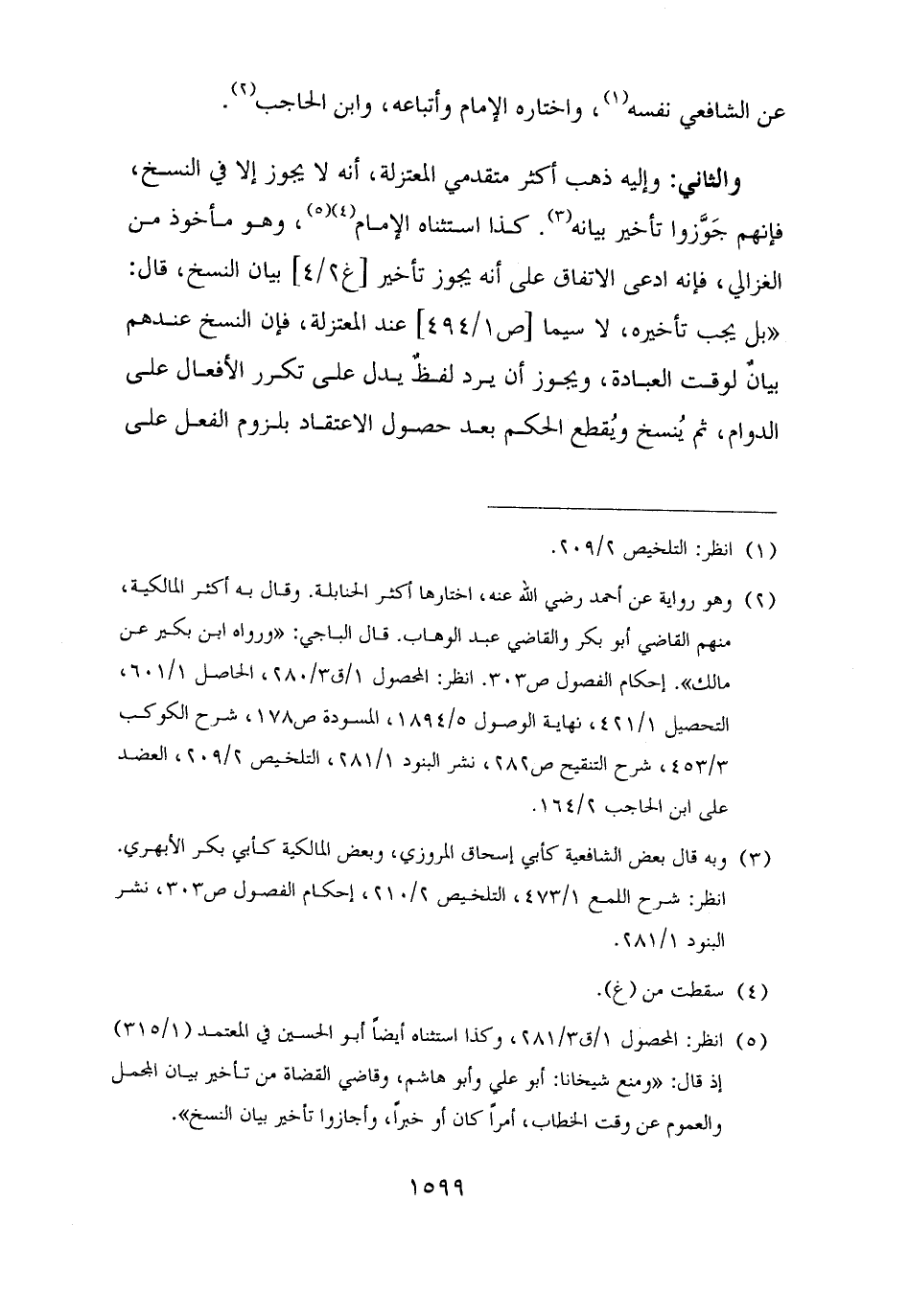 والثاني: وإليه ذهب أكثر متقدمي المعتزلة، أنه لا يجوز إلا في النسخ، فإنهم جَوَّزوا تأخير بيانه (¬٣). كذا استثناه الإمام (¬٤) (¬٥)، وهو مأخوذ من الغزالي، فإنه ادعى الاتفاق على أنه يجوز تأخير بيان النسخ، قال: "بل يجب تأخيره، لا سيما عند المعتزلة، فإن النسخ عندهم بيانٌ لوقت العبادة، ويجوز أن يرد لفظٌ يدل على تكرر الأفعال على الدوام، ثم يُنسخ ويُقطع الحكم بعد حصول الاعتقاد بلزوم الفعل على