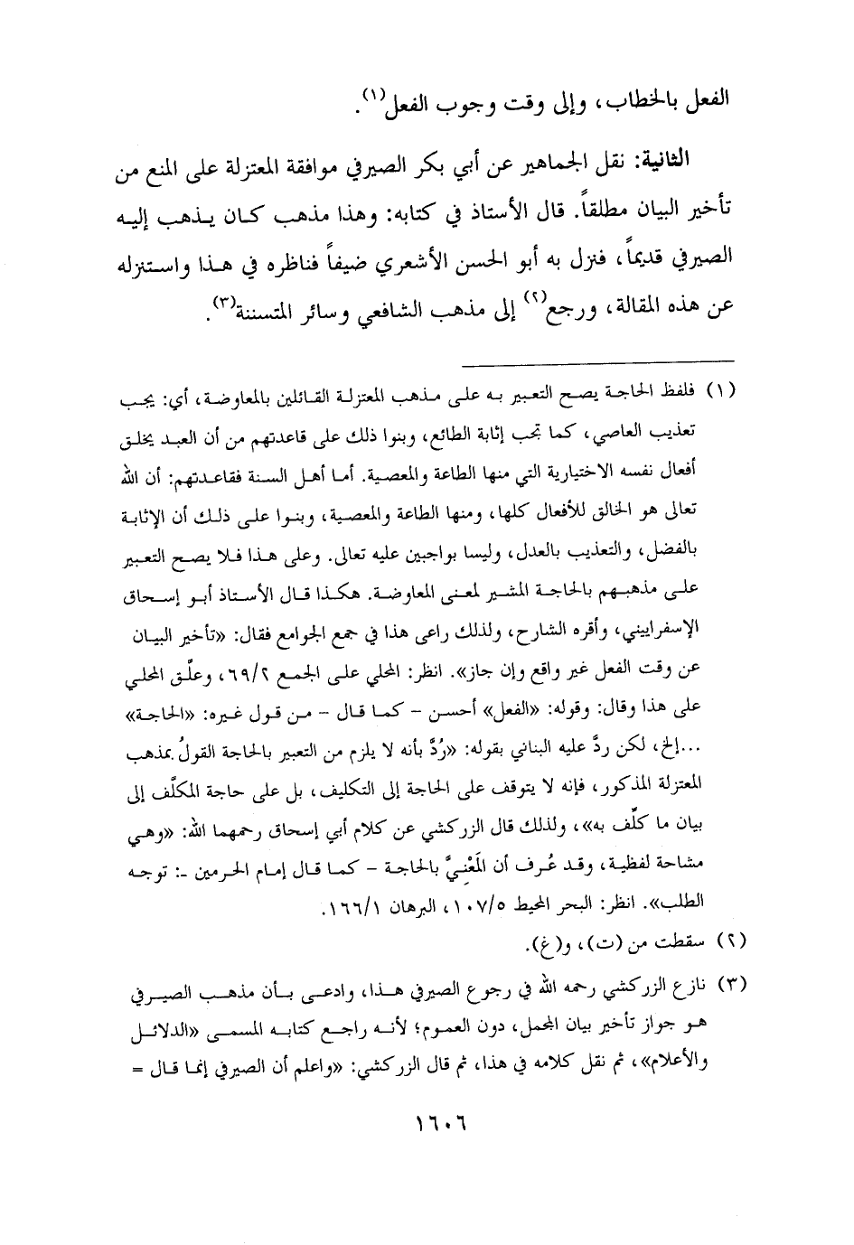 (¬١) فلفظ الحاجة يصح التعبير به على مذهب المعتزلة القائلين بالمعاوضة، أي: يجب تعذيب العاصي، كما تجب إثابة الطائع، وبنوا ذلك على قاعدتهم من أن العبد يخلق أفعال نفسه الاختيارية التي منها الطاعة والمعصية. أما أهل السنة فقاعدتهم: أن الله تعالى هو الخالق للأفعال كلها، ومنها الطاعة والمعصية، وبنوا على ذلك أن الإثابة بالفضل، والتعذيب بالعدل، وليسا بواجبين عليه تعالى. وعلى هذا فلا يصح التعبير على مذهبهم بالحاجة المشير لمعنى المعاوضة. هكذا قال الأستاذ أبو إسحاق الإسفراييني، وأقره الشارح، ولذلك راعى هذا في جمع الجوامع فقال: "تأخير البيان عن وقت الفعل غير واقع وإن جاز". انظر: المحلي على الجمع ٢/ ٦٩، وعلَّق المحلي على هذا وقال: وقوله: "الفعل" أحسن - كما قال - من قول غيره: "الحاجة". . . إلخ، لكن ردَّ عليه البناني بقوله: "رُدَّ بأنه لا يلزم من التعبير بالحاجة القولُ بمذهب المعتزلة المذكور، فإنه لا يتوقف على الحاجة إلى التكليف، بل على حاجة المكلَّف إلى بيان ما كلِّف به"، ولذلك قال الزركشي عن كلام أبي إسحاق رحمهما الله: "وهي مشاحة لفظية، وقد عُرف أن المَعْنِيَّ بالحاجة - كما قال إمام الحرمين -: توجه الطلب". انظر: البحر المحيط ٥/ ١٠٧، البرهان ١/ ١٦٦.
