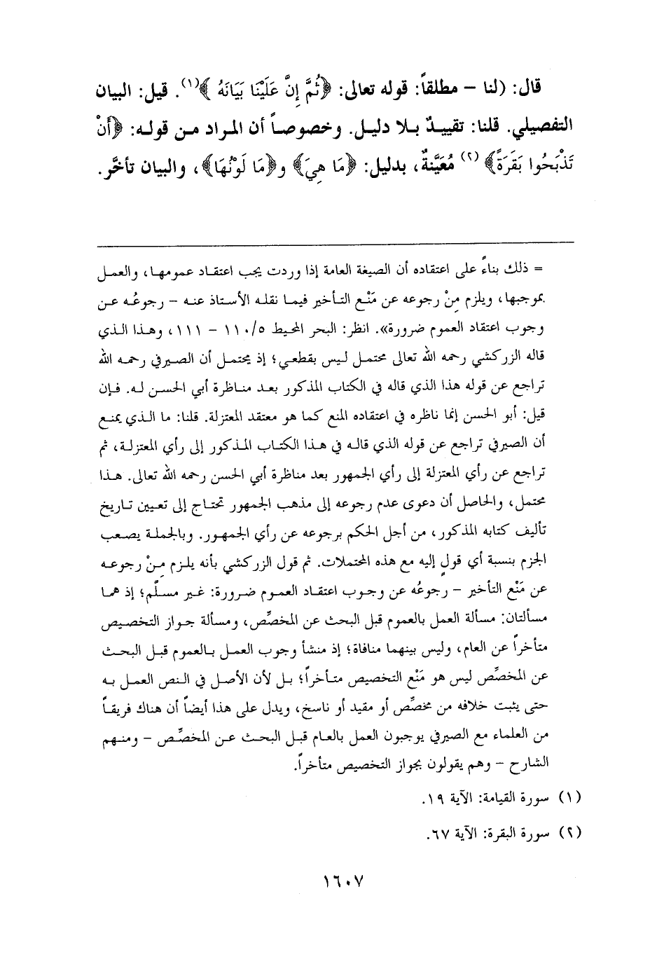 = ذلك بناءً على اعتقاده أن الصيغة العامة إذا وردت يجب اعتقاد عمومها، والعمل بموجبها، ويلزم مِنْ رجوعه عن مَنْع التأخير فيما نقله الأستاذ عنه - رجوعُه عن وجوب اعتقاد العموم ضرورة". انظر: البحر المحيط ٥/ ١١٠ - ١١١، وهذا الذي قاله الزركشي رحمه الله تعالى محتمل ليس بقطعي؛ إذ يحتمل أن الصيرفي رحمه الله تراجع عن قوله هذا الذي قاله في الكتاب المذكور بعد مناظرة أبي الحسن له. فإن قيل: أبو الحسن إنما ناظره في اعتقاده المنع كما هو معتقد المعتزلة. قلنا: ما الذي يمنع أن الصيرفي تراجع عن قوله الذي قاله في هذا الكتاب المذكور إلى رأي المعتزلة، ثم تراجع عن رأي المعتزلة إلى رأي الجمهور بعد مناظرة أبي الحسن رحمه الله تعالى. هذا محتمل، والحاصل أن دعوى عدم رجوعه إلى مذهب الجمهور تحتاج إلى تعيين تاريخ تأليف كتابه المذكور، من أجل الحكم برجوعه عن رأي الجمهور. وبالجملة يصعب الجزم بنسبة أي قولٍ إليه مع هذه المحتملات. ثم قول الزركشي بأنه يلزم مِنْ رجوعه عن مَنْع التأخير - رجوعُه عن وجوب اعتقاد العموم ضرورة: غير مسلّم؛ إذ هما مسألتان: مسألة العمل بالعموم قبل البحث عن المخصِّص، ومسألة جواز التخصيص متأخرًا عن العام، وليس بينهما منافاة؛ إذ منشأ وجوب العمل بالعموم قبل البحث عن المخصِّص ليس هو مَنْع التخصيص متأخرًا؛ بل لأن الأصل في النص العمل به حتى يثبت خلافه من مخصِّص أو مقيد أو ناسخ، ويدل على هذا أيضًا أن هناك فريقًا من العلماء مع الصيرفي يوجبون العمل بالعام قبل البحث عن المخصِّص - ومنهم الشارح - وهم يقولون بجواز التخصيص متأخرًا.