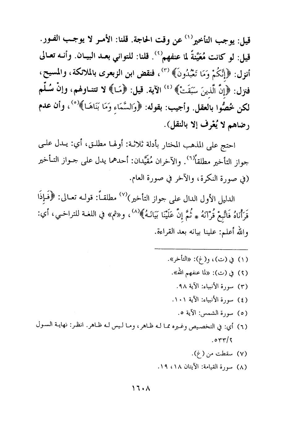 الدليل الأول الدال على جواز التأخير) (¬٧) مطلقًا: قوله تعالى: {فَإِذَا قَرَأْنَاهُ فَاتَّبِعْ قُرْآنَهُ (١٨) ثُمَّ إِنَّ عَلَيْنَا بَيَانَهُ} (¬٨)، و"ثم" في اللغة للتراخي، أي: والله أعلم: علينا بيانه بعد القراءة.