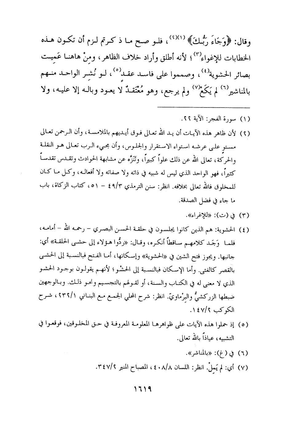 (¬٤) الحشوية: هم الذين كانوا يجلسون في حلقة الحسن البصري - رحمه الله - أمامه، فلما وَجَد كلامهم ساقطًا أنكره، وقال: "ردُّوا هؤلاء إلى حشى الحلقة" أي: جانبها. ويجوز فتح الشين في "الحشوية" وإسكانها، أما الفتح فبالنسبة إلى الحشى بالقصر كالفتى. وأما الإسكان فبالنسبة إلى الحشْو؛ لأنهم يقولون بوجود الحشو الذي لا معنى له في الكتاب والسنة، أو لقولهم بالتجسيم ونحو ذلك. وبالوجهين ضبطها الزركشيُّ والبِرْماويّ. انظر: شرح المحلي الجمع مع البناني ١/ ٢٣٢، شرح الكوكب ٢/ ١٤٧.