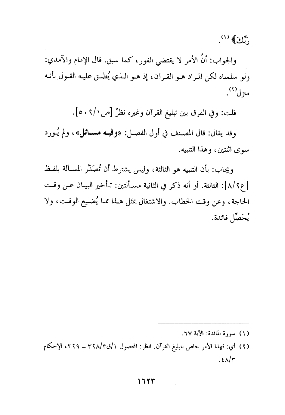 (¬٢) أي: فهذا الأمر خاص بتبليغ القرآن. انظر: المحصول ١/ ق ٣/ ٣٢٨ - ٣٢٩، الإحكام ٣/ ٤٨.