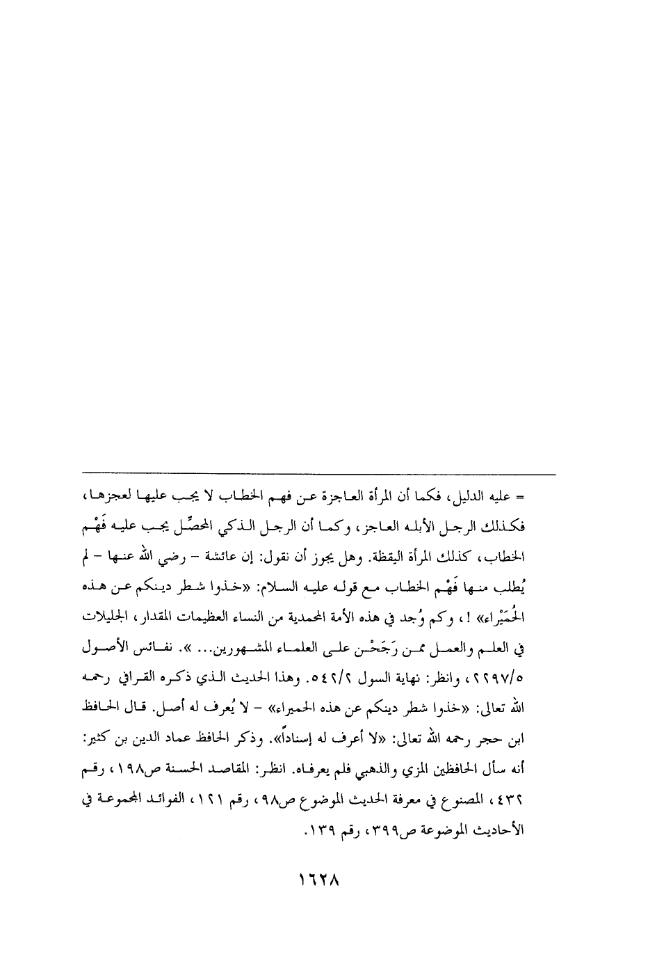 = عليه الدليل، فكما أن المرأة العاجزة عن فهم الخطاب لا يجب عليها لعجزها، فكذلك لرجل الأبله العاجز، وكما أن الرجل الذكي المحصِّل يجب عليه فَهْم الخطاب، كذلك المرأة اليقظة. وهل يجوز أن نقول: إن عائشة - رضي الله عنها - لم يُطلب منها فَهْم الخطاب مع قوله عليه السلام: "خذوا شطر دينكم عن هذه الحُمَيْراء"! ، وكم وُجد في هذه الأمة المحمدية من النساء العظيمات المقدار، الجليلات في العلم والعمل ممن رَجَحْن على العلماء المشهورين. . .". نفائس الأصول ٥/ ٢٢٩٧، وانظر: نهاية السول ٢/ ٥٤٢. وهذا الحديث الذي ذكره القرافي رحمه الله تعالى: "خذوا شطر دينكم عن هذه الحميراء" - لا يُعرف له أصل. قال الحافظ ابن حجر رحمه الله تعالى: "لا أعرف له إسنادًا". وذكر الحافظ عماد الدين بن كثير: أنه سأل الحافظين المزى والذهبي فلم يعرفاه. انظر: المقاصد الحسنة ص ١٩٨، رقم ٤٣٢، المصنوع في معرفة الحديث الموضوع ص ٩٨، رقم ١٢١، الفوائد المجموعة في الأحاديث الوضوعة ص ٣٩٩، رقم ١٣٩.