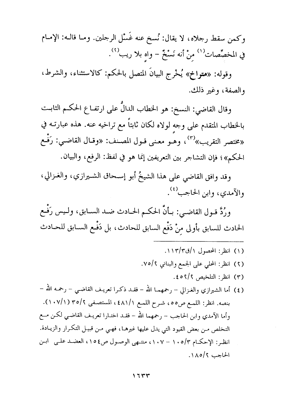 وقال القاضي: النسخ: هو الخطاب الدالُّ على ارتفاع الحكم الثابت بالخطاب المتقدم على وجهٍ لولاه لكان ثابتًا مع تراخيه عنه. هذه عبارته في "مختصر التقريب" (¬٣)، وهو معنى قول المصنف: "وقال القاضي: رَفْع الحكم"؛ فإن التشاجر بين التعريفين إنما هو في لفظ: الرفع، والبيان.