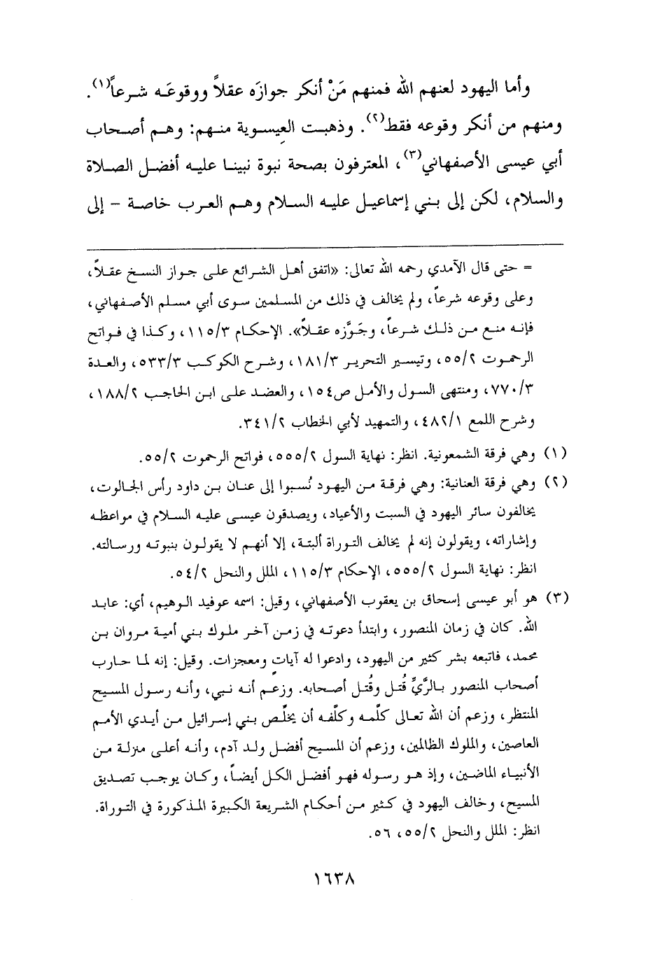 وأما اليهود لعنهم الله فمنهم مَنْ أنكر جوازَه عقلًا ووقوعَه شرعًا (¬١). ومنهم من أنكر وقوعه فقط (¬٢). وذهبت العِيسوية منهم: وهم أصحاب أبي عيسى الأصفهاني (¬٣)، المعترفون بصحة نبوة نبينا عليه أفضل الصلاة والسلام، لكن إلى بني إسماعيل عليه السلام وهم العرب خاصة - إلى