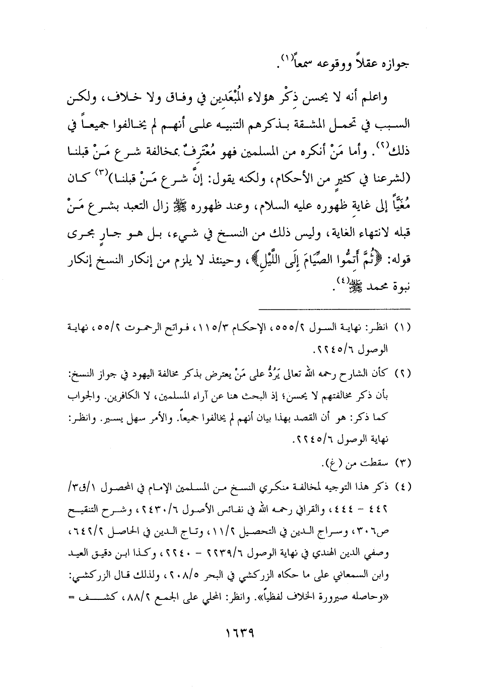 (¬٢) كأن الشارح رحمه الله تعالى يَرُدُّ على مَنْ يعترض بذكر مخالفة اليهود في جواز النسخ: بأن ذكر مخالفتهم لا يحسن، إذ البحث هنا عن آراء المسلمين، لا الكافرين. والجواب كما ذكر: هو أن القصد بهذا بيان أنهم لم يخالفوا جميعًا. والأمر سهل يسير. وانظر: نهاية الوصول ٦/ ٢٢٤٥.