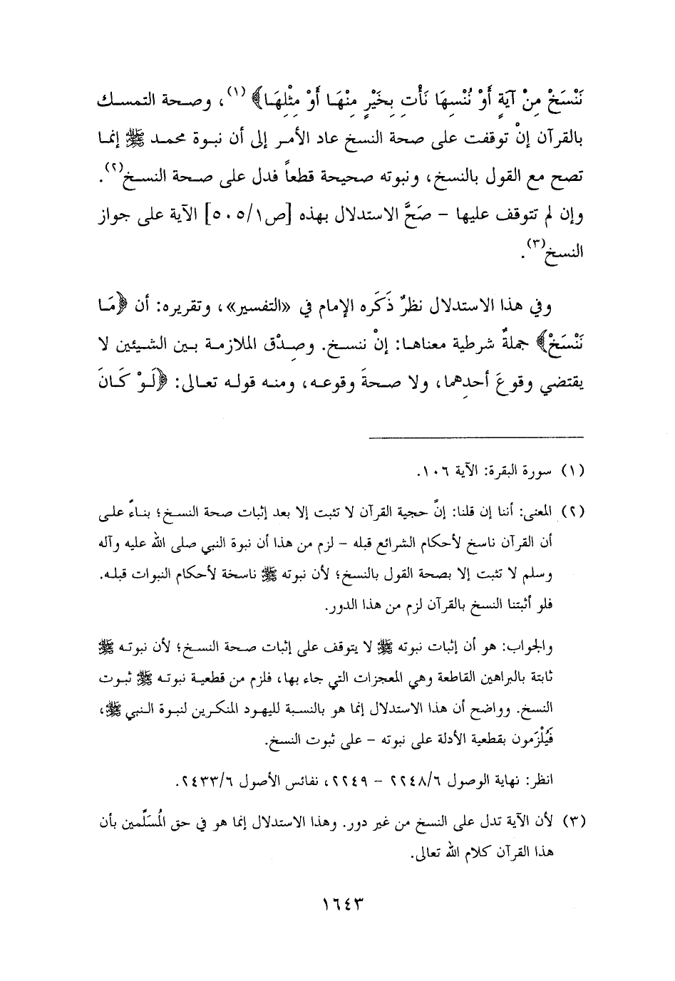 (¬٢) المعنى: أننا إن قلنا: إنَّ حجية القرآن لا تثبت إلا بعد إثبات صحة النسخ؛ بناءً على أن القرآن ناسخ لأحكام الشرائع قبله - لزم من هذا أن نبوة النبي صلى الله عليه وآله وسلم لا تثبت إلا بصحة القول بالنسخ؛ لأن نبوته - صلى الله عليه وسلم - ناسخة لأحكام النبوات قبله. فلو أثبتنا النسخ بالقرآن لزم من هذا الدور.