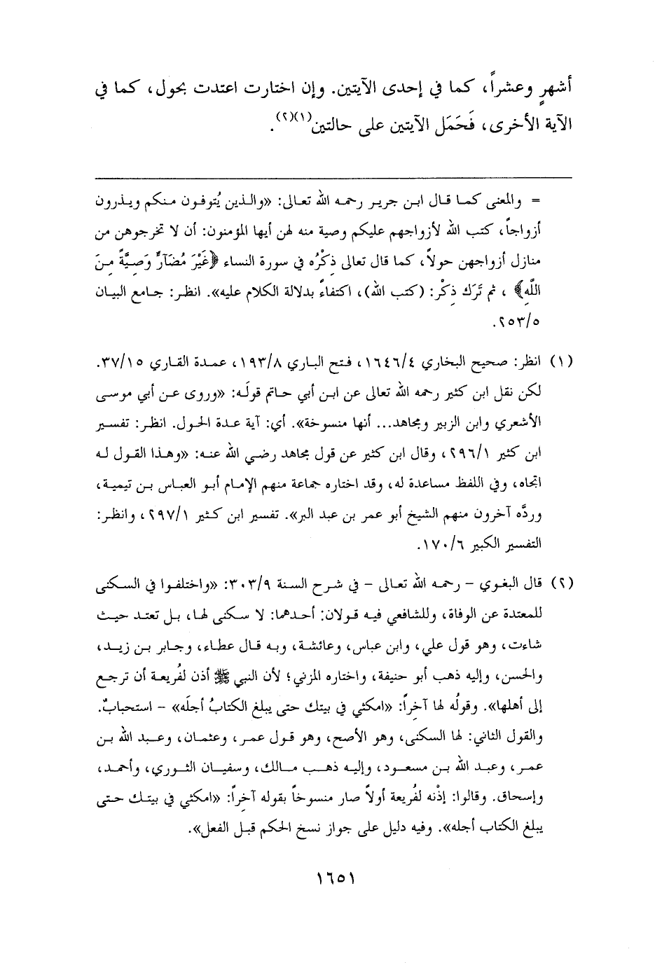 (¬١) انظر: صحيح البخاري ٤/ ١٦٤٦، فتح الباري ٨/ ١٩٣، عمدة القاري ١٥/ ٣٧. لكن نقل ابن كثير رحمه الله تعالى عن ابن أبي حاتم قولَه: "وروى عن أبي موسى الأشعري وابن الزبير ومجاهد. . . أنها منسوخة". أي: آية عدة الحول. انظر: تفسير ابن كثير ١/ ٢٩٦، وقال ابن كثير عن قول مجاهد رضي الله عنه: "وهذا القول له اتجاه، وفي اللفظ مساعدة له، وقد اختاره جماعة منهم الإمام أبو العباس بن تيمية، وردَّه آخرون منهم الشيخ أبو عمر بن عبد البر". تفسير ابن كثير ١/ ٢٩٧، وانظر: التفسير الكبير ٦/ ١٧٠.