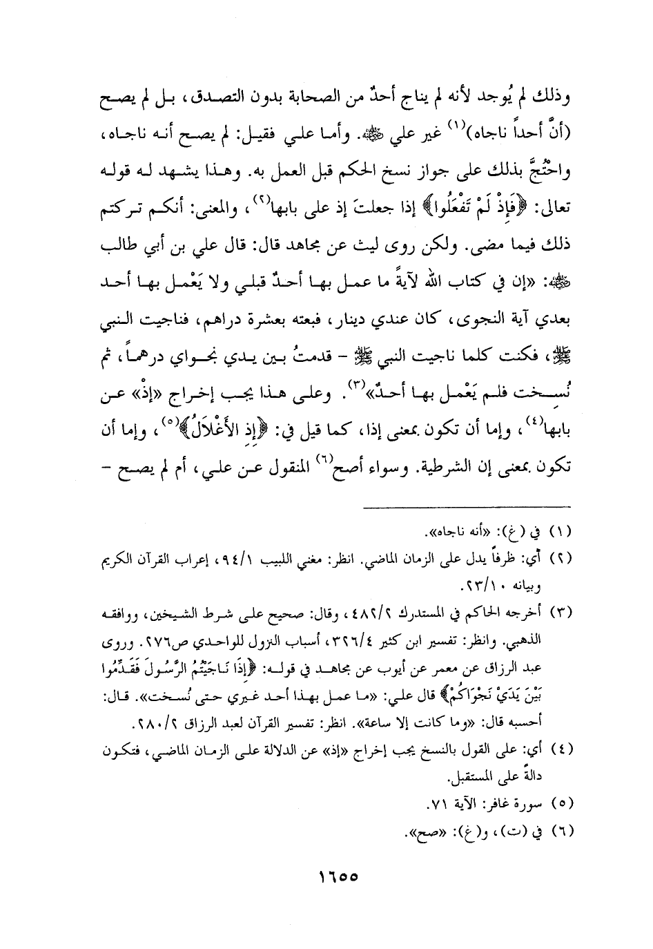 (¬٣) أخرجه الحاكم في المستدرك ٢/ ٤٨٢، وقال: صحيح على شرط الشيخين، ووافقه الذهبي. وانظر: تفسير ابن كثير ٤/ ٣٢٦، أسباب النزول للواحدي ص ٢٧٦. وروى عبد الرزاق عن معمر عن أيوب عن مجاهد في قوله: {إِذَا نَاجَيْتُمُ الرَّسُولَ فَقَدِّمُوا بَيْنَ يَدَيْ نَجْوَاكُمْ} قال علي: "ما عمل بهذا أحد غيري حتى نُسخت". قال: أحسبه قال: "وما كانت إلا ساعة". انظر: تفسير القرآن لعبد الرزاق ٢/ ٢٨٠.