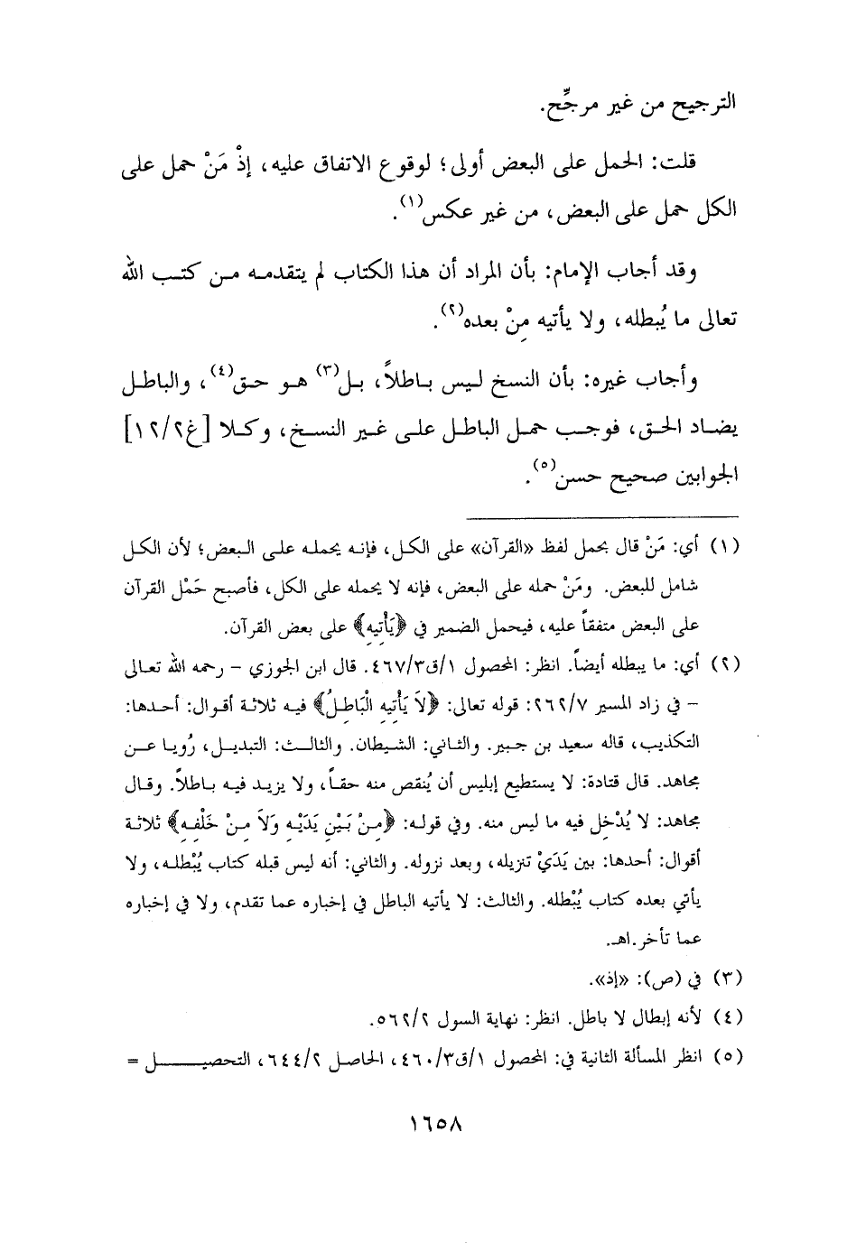 (¬٢) أي: ما يبطله أيضًا. انظر: المحصول ١/ ق ٣/ ٤٦٧. قال ابن الجوزي - رحمه الله تعالى - في زاد المسير ٧/ ٢٦٢: قوله تعالى: {لَا يَأْتِيهِ الْبَاطِلُ} فيه ثلاثة أقوال: أحدها: التكذيب، قاله سعيد بن جبير. والثاني: الشيطان. والثالث: التبديل، رُويا عن مجاهد. قال قتادة: لا يستطيع إبليس أن يُنقص منه حقًا، ولا يزيد فيه باطلًا. وقال مجاهد: لا يُدْخِل فيه ما ليس منه. وفي قوله: {مِنْ بَيْنِ يَدَيْهِ وَلَا مِنْ خَلْفِهِ} أقوال: أحدها: بين يَدَيْ تنزيله، وبعد نزوله. والثاني: أنه ليس قبله كتاب يُبْطله، ولا يأتي بعده كتاب يُبْطله. والثالث: لا يأتيه الباطل في إخباره عما تقدم، ولا في إخباره عما تأخر. اهـ.