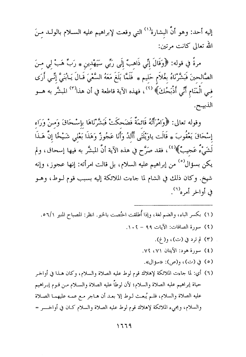 وقوله تعالى: {وَامْرَأَتُهُ قَائِمَةٌ فَضَحِكَتْ فَبَشَّرْنَاهَا بِإِسْحَاقَ وَمِنْ وَرَاءِ إِسْحَاقَ يَعْقُوبَ (٧١) قَالَتْ يَاوَيْلَتَى أَأَلِدُ وَأَنَا عَجُوزٌ وَهَذَا بَعْلِي شَيْخًا إِنَّ هَذَا لَشَيْءٌ عَجِيبٌ} (¬٤)، فقد صَرَّح في هذه الآية أنَّ المبشَّر به فيها إسحاق، ولم يكن بسؤال (¬٥) من إبراهيم عليه السلام، بل قالت امرأته: إنها عجوز، وإنه شيخ. وكان ذلك في الشام لما جاءت الملائكة إليه بسبب قوم لوط، وهو في أواخر أمره (¬٦).