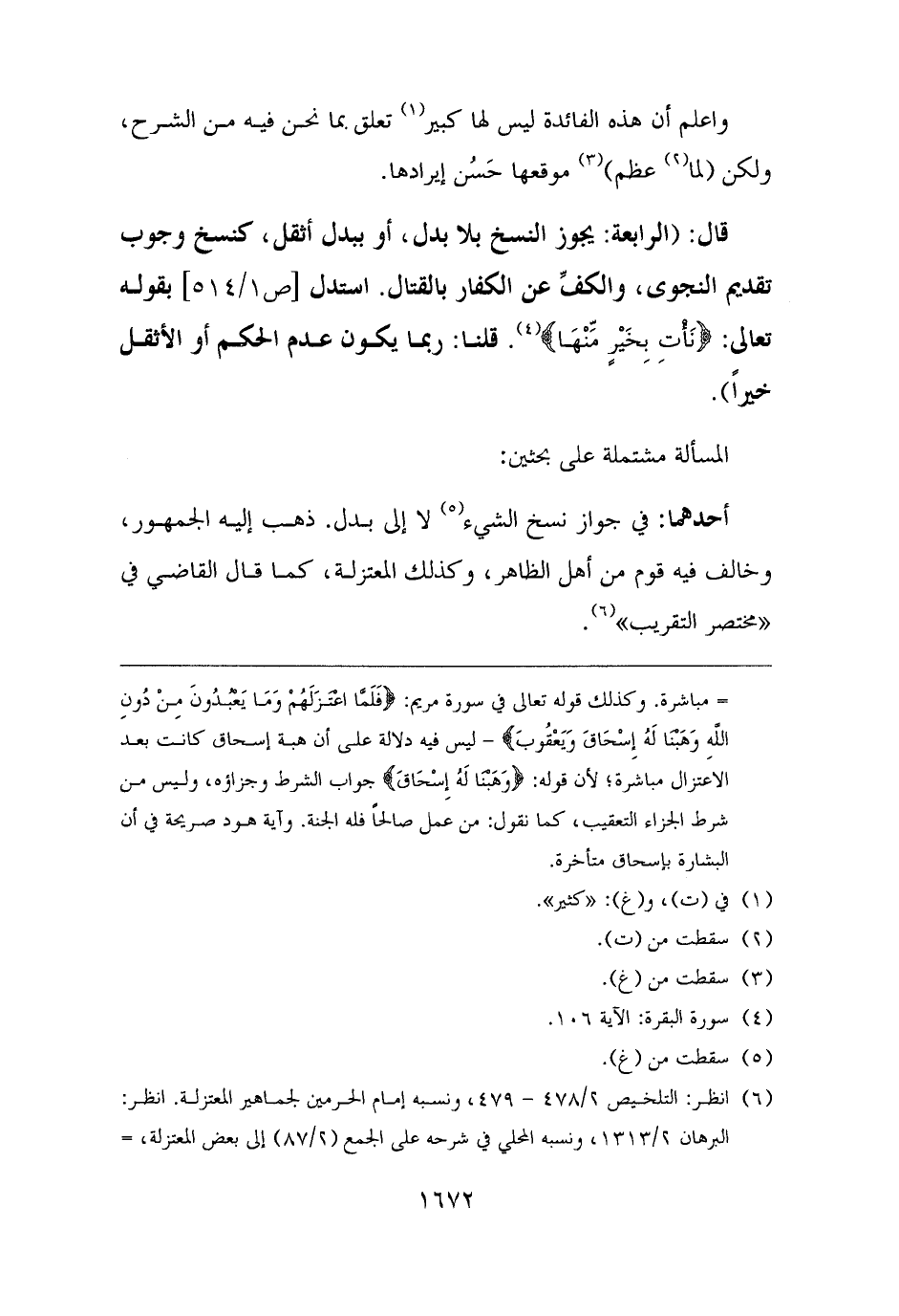 (¬٦) انظر: التلخيص ٢/ ٤٧٨ - ٤٧٩، ونسبه إمام الحرمين لجماهير المعتزلة. انظر: البرهان ٢/ ١٣١٣، ونسبه المحلي في شرحه على الجمع (٢/ ٨٧) إلى بعض المعتزلة، =