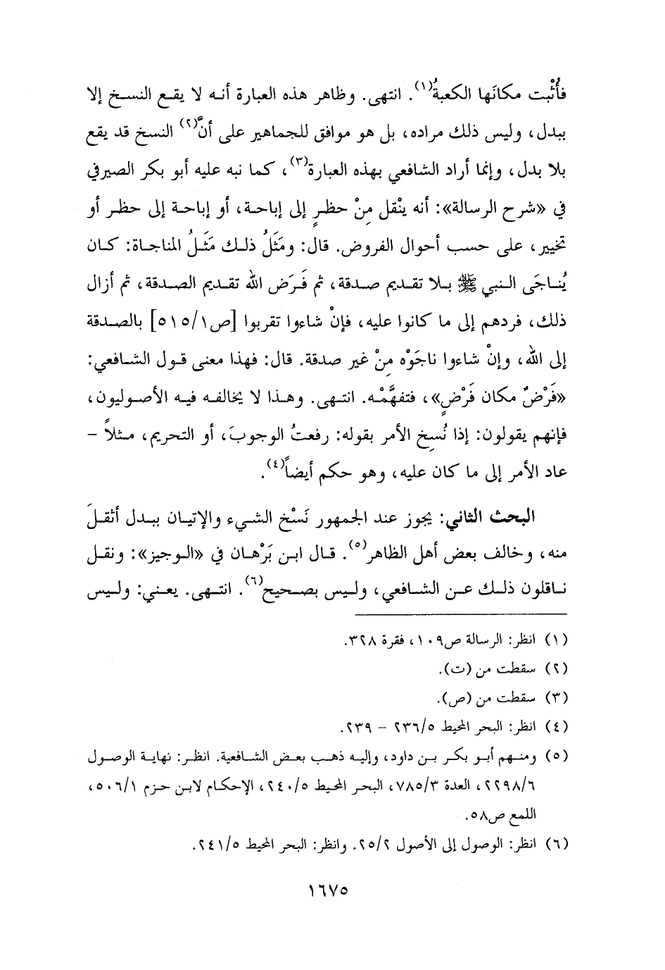فأُثْبت مكانَها الكعبةُ (¬١). انتهى. وظاهر هذه العبارة أنه لا يقع النسخ إلا ببدل، وليس ذلك مراده، بل هو موافق للجماهير على أنَّ (¬٢) النسخ قد يقع بلا بدل، وإنما أراد الشافعي بهذه العبارة (¬٣)، كما نبه عليه أبو بكر الصيرفي في "شرح الرسالة": أنه ينْقل مِنْ حظرٍ إلى إباحة، أو إباحة إلى حظر أو تخيير، على حسب أحوال الفروض. قال: ومَثَلُ ذلك مَثَلُ المناجاة: كان يُناجَى النبي - صلى الله عليه وسلم - بلا تقديم صدقة، ثم فَرَض الله تقديم الصدقة، ثم أزال ذلك، فردهم إلى ما كانوا عليه، فإنْ شاءوا تقربوا بالصدقة إلى الله، وإنْ شاءوا ناجَوْه مِنْ غير صدقة. قال: فإذا معنى قول الشافعي: "فَرْضٌ مكان فَرْضٍ"، فتفهَّمْه. انتهى. وهذا لا يخالفه فيه الأصوليون، فإنهم يقولون: إذا نُسِخ الأمر بقوله: رفعتُ الوجوبَ، أو التحريم، مثلًا - عاد الأمر إلى ما كان عليه، وهو حكم أيضًا (¬٤).
