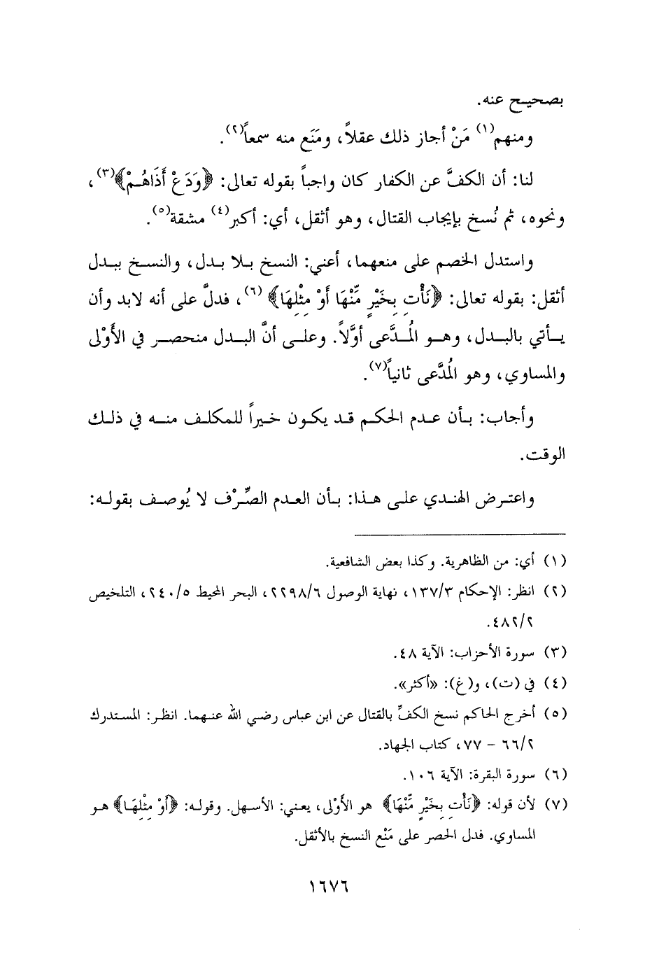 واستدل الخصم على منعهما، أعني: النسخ بلا بدل، والنسخ ببدل أثقل: بقوله تعالى: {نَأْتِ بِخَيْرٍ مِنْهَا أَوْ مِثْلِهَا} (¬٦)، فدلَّ على أنه لا بد وأن يأتي بالبدل، وهو المُدَّعى أوَّلًا. وعلى أنَّ البدل منحصر في الأَوْلى والمساوي، وهو المُدَّعى ثانيًا (¬٧).