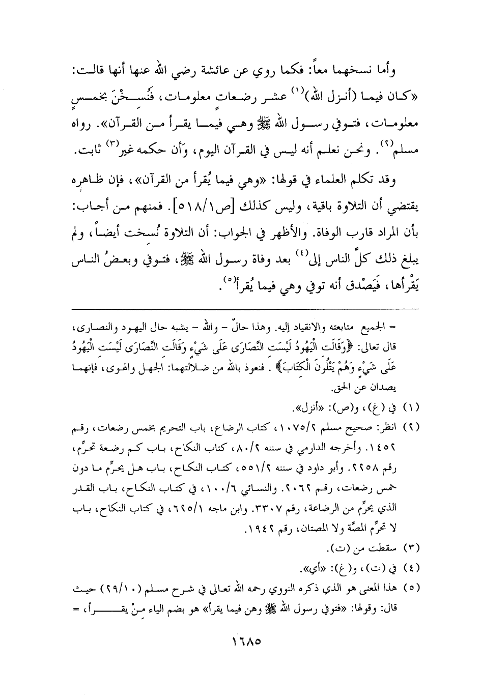 وأما نسخهما معًا: فكما روي عن عائشة رضي الله عنها أنها قالت: "كان فيما (أنزل الله) (¬١) عشر رضعاتٍ معلومات، فَنُسِخْنَ بخمسٍ معلومات، فتوفي رسول الله - صلى الله عليه وسلم - وهي فيما يقرأ من القرآن". رواه مسلم (¬٢). ونحن نعلم أنه ليس في القرآن اليوم، وَأن حكمه غير (¬٣) ثابت.