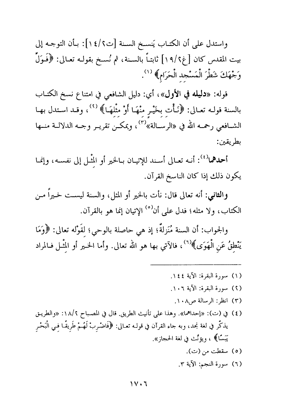 قوله: "في ليله في الأول"، أي: دليل الشافعي في امتناع نسخ الكتاب بالسنة قوله تعالى: {نَأْتِ بِخَيْرٍ مِنْهَا أَوْ مِثْلِهَا} (¬٢)، وقد استدل بها الشافعي رحمه الله في "الرسالة" (¬٣)، ويمكن تقرير وجه الدلالة منها بطريقين: