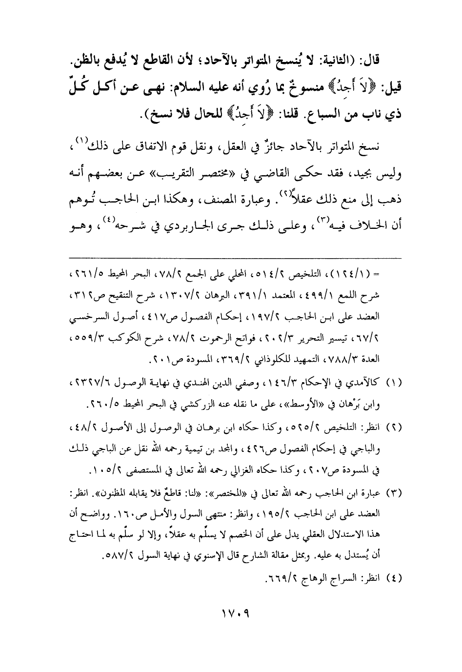 قال: (الثانية: لا يُنسخ المتواتر بالآحاد؛ لأن القاطع لا يُدفع بالظن. قيل: {لَا أَجِدُ} منسوخٌ بما رُوي أنه عليه السلام: نهى عن أكل كُلِّ ذي ناب من السباع. قلنا: {لَا أَجِدُ} للحال فلا نسخ).