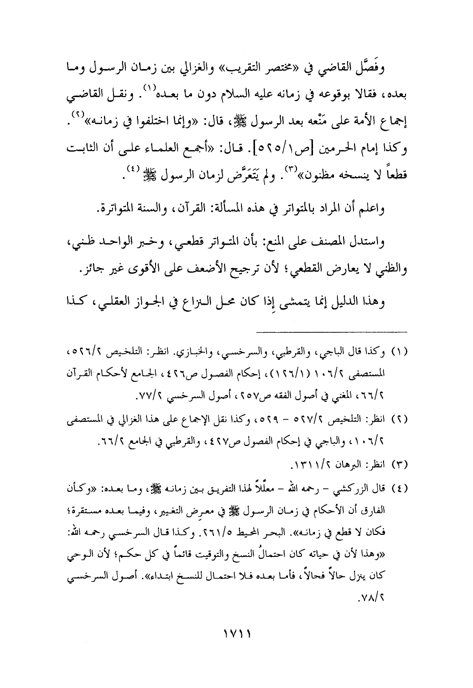(¬٤) قال الزركشي - رحمه الله - معلِّلًا لهذا التفريق بين زمانه - صلى الله عليه وسلم -، وما بعده: "وكأن الفارق أن الأحكام في زمان الرسول - صلى الله عليه وسلم - في معرِض التغيير، وفيما بعده مستقرة؛ فكان لا قطع في زمانه". البحر المحيط ٥/ ٢٦١. وكذا قال السرخسي رحمه الله: "وهذا لأن في حياته كان احتمالُ النسخ والتوقيت قائمًا في كل حكم؛ لأن الوحي كان ينزل حالًا فحالًا، فأما بعده فلا احتمال للنسخ ابتداء". أصول السرخسي ٢/ ٧٨.