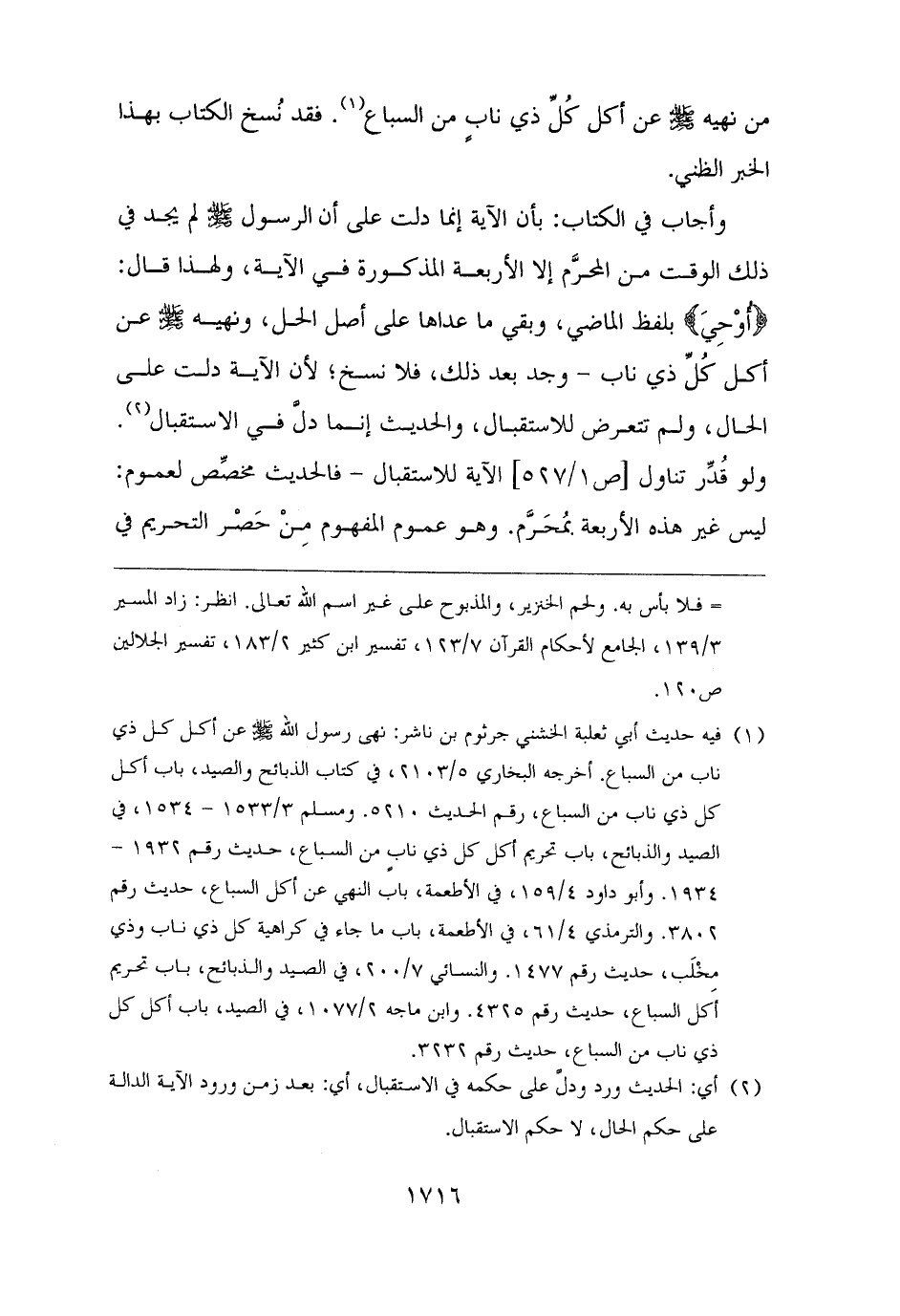 وأجاب في الكتاب: بأن الآية إنما دلت على أن الرسول - صلى الله عليه وسلم - لم يجد في ذلك الوقت من المحرَّم إلا الأربعة المذكورة في الآية، ولهذا قال: {أُوحِيَ} بلفظ الماضي، وبقي ما عداها على أصل الحل، ونهيه - صلى الله عليه وسلم - عن أكل كُلِّ ذي ناب - وجد بعد ذلك، فلا نسخ؛ لأن الآية دلت على الحال، ولم تتعرض للاستقبال، والحديث إنما دلَّ في الاستقبال (¬٢). ولو قُدِّر تناول الآية للاستقبال - فالحديث مخصِّص لعموم: ليس غير هذه الأربعة بمُحَرَّم. وهو عموم المفهوم مِنْ حَصْر التحريم في