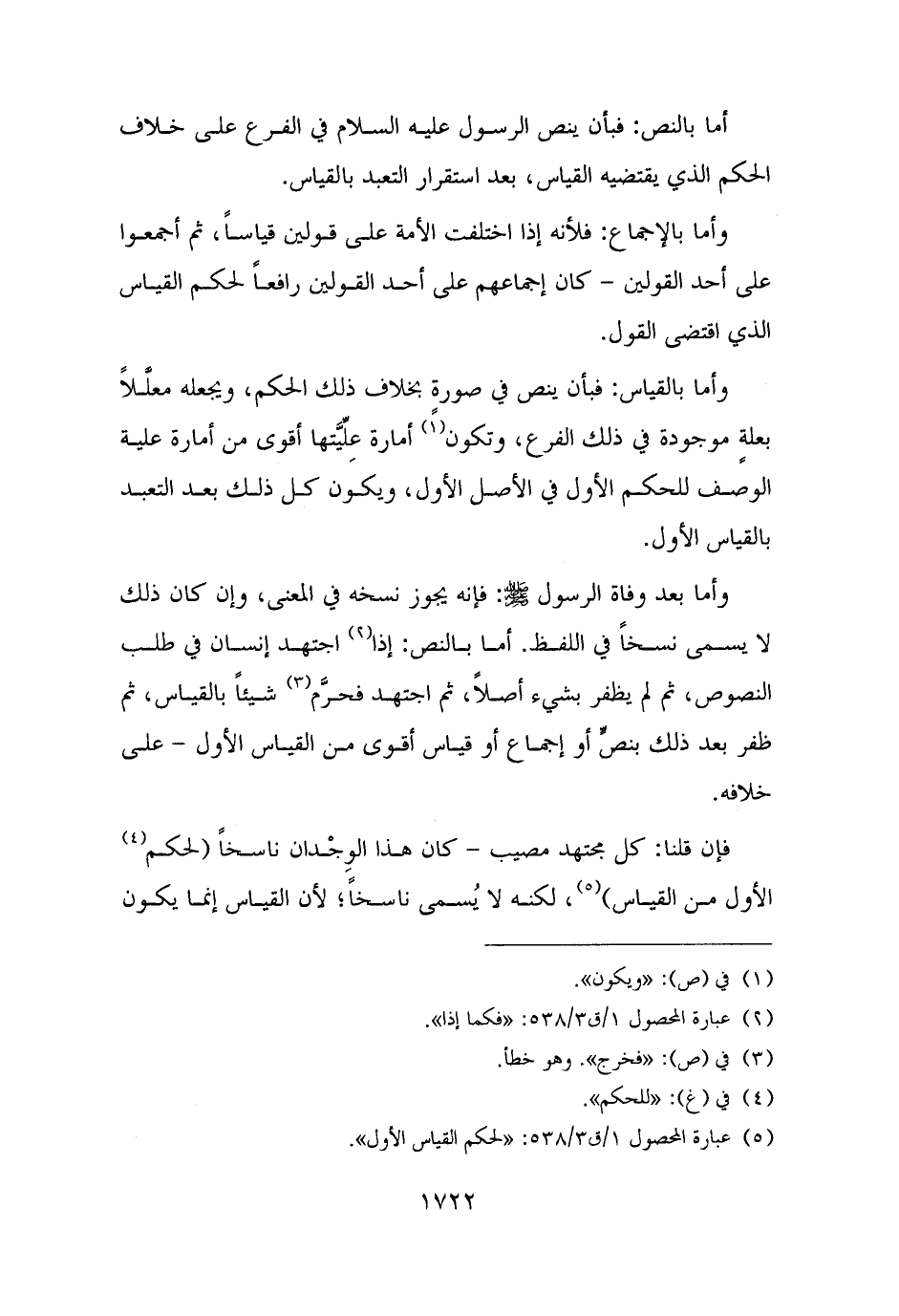 وأما بعد وفاة الرسول - صلى الله عليه وسلم -: فإنه يجوز نسخه في المعنى، وإن كان ذلك لا يسمى نسخًا في اللفظ. أما بالنص: إذا (¬٢) اجتهد إنسان في طلب النصوص، ثم لم يظفر بشيء أصلًا، ثم اجتهد فحرَّم (¬٣) شيئًا بالقياس، ثم ظفر بعد ذلك بنصٍّ أو إجماع أو قياس أقوى من القياس الأول - على خلافه.